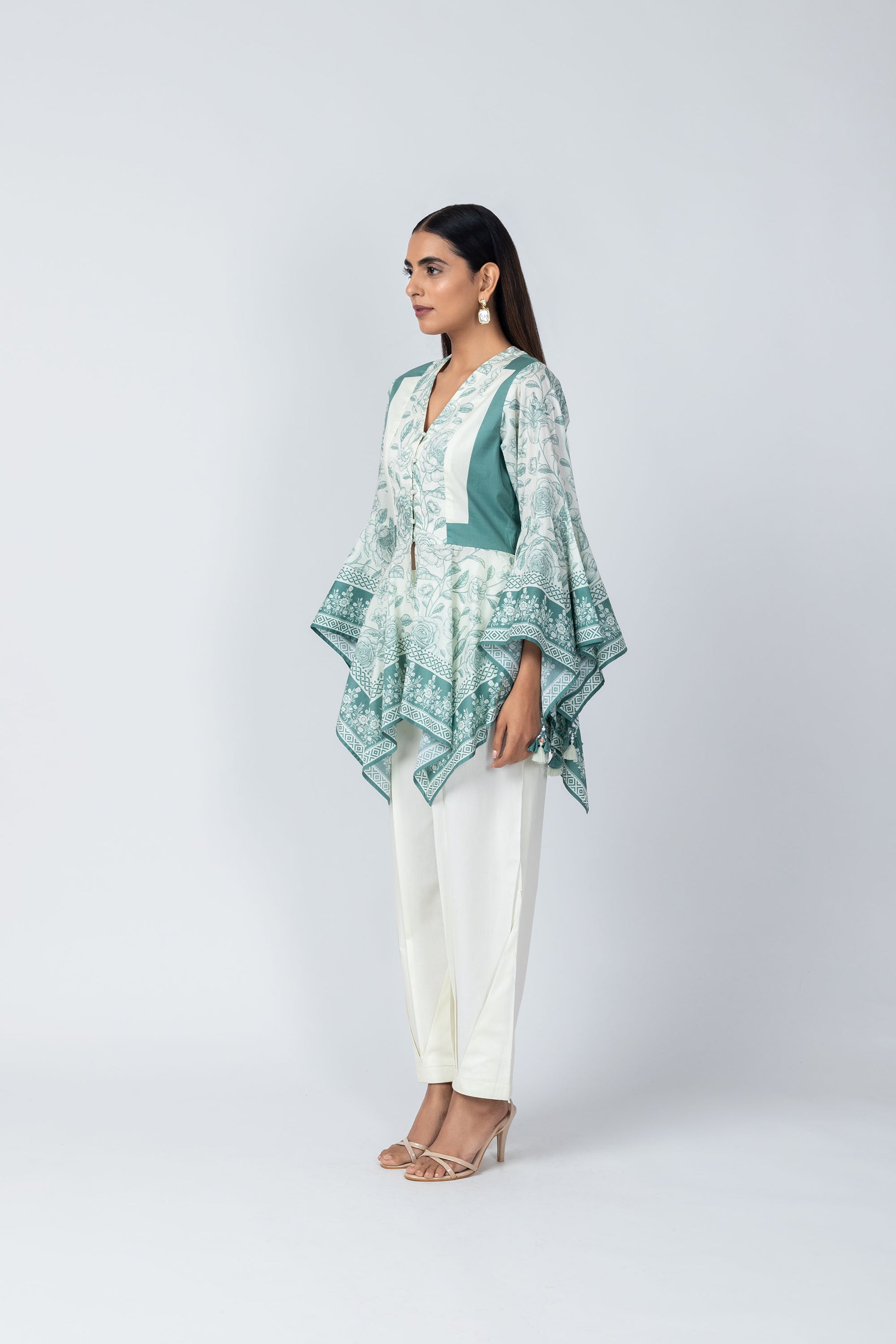 Floral and Geometric Printed Top with Ivory Crepe Dhoti A beautiful top with a mix of floral and geometric prints, featuring wide flared sleeves and hem with small tassels for added detail. Paired with relaxed ivory crepe dhoti pants for comfort and style, creating a classic and easy-to-wear outfit.Product Type: Co-ord Set Pattern: Floral & Geometric Print Length: Top – Hip; Dhoti – Full Closure: Slip-On Lining: Fully Lined