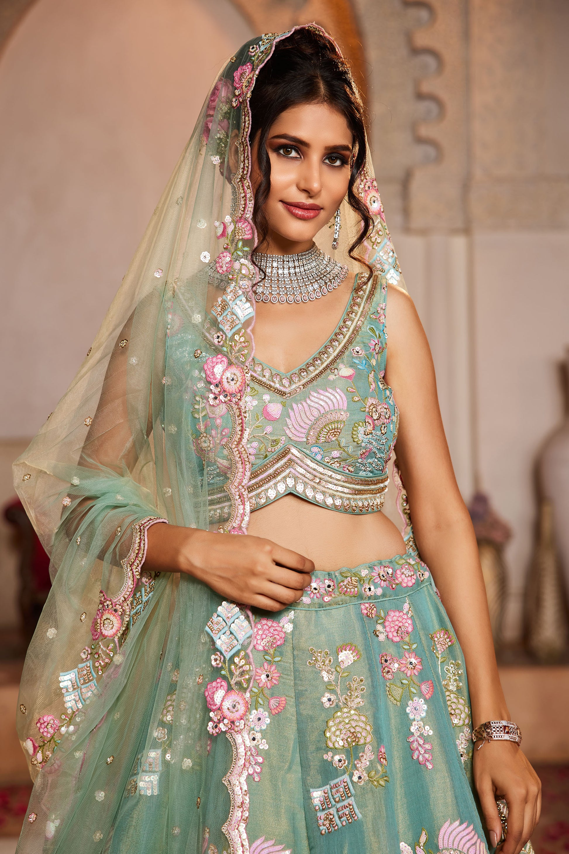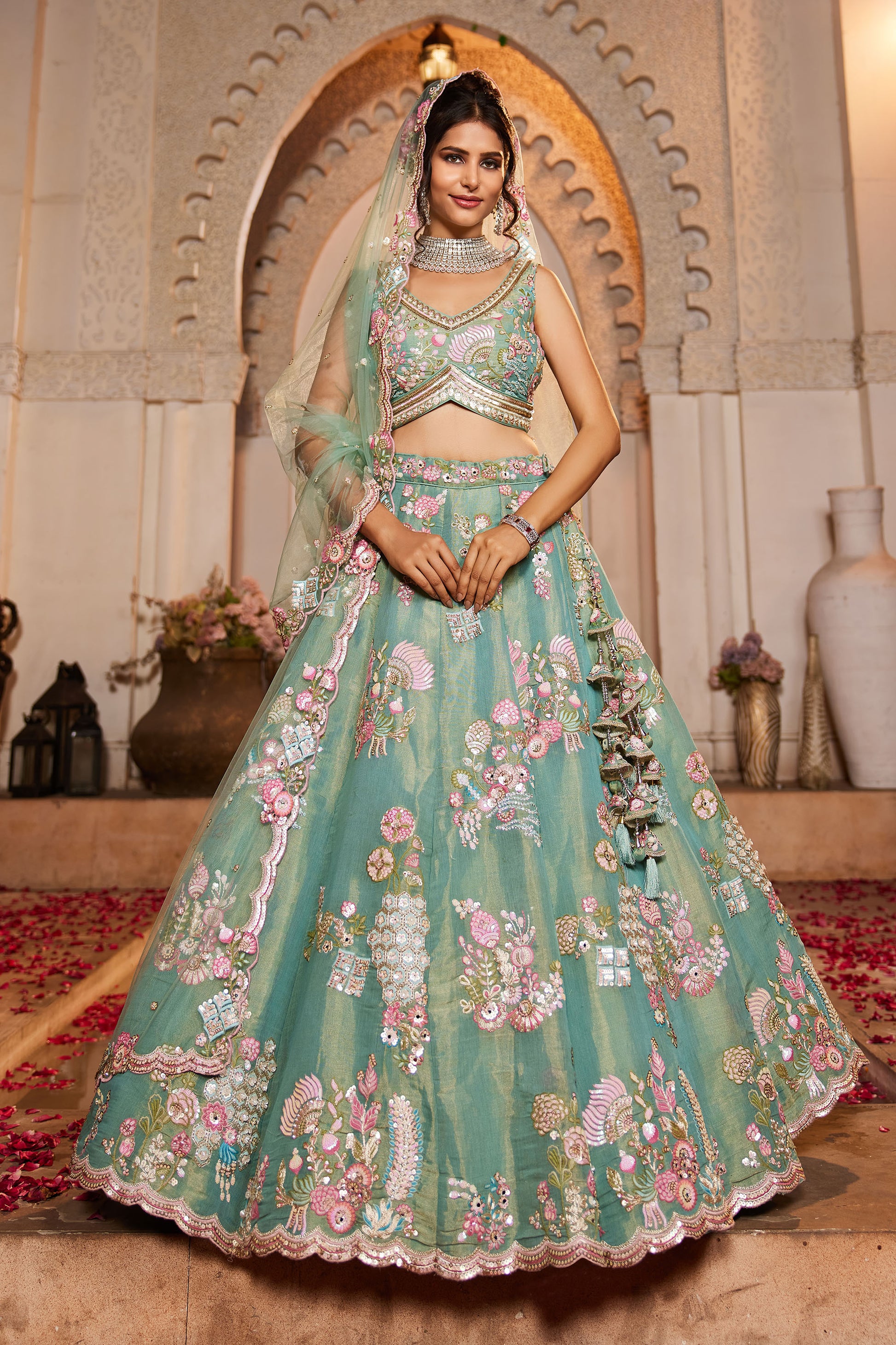 Sea Green Net Sequins embroidery Lehenga choli & Dupatta