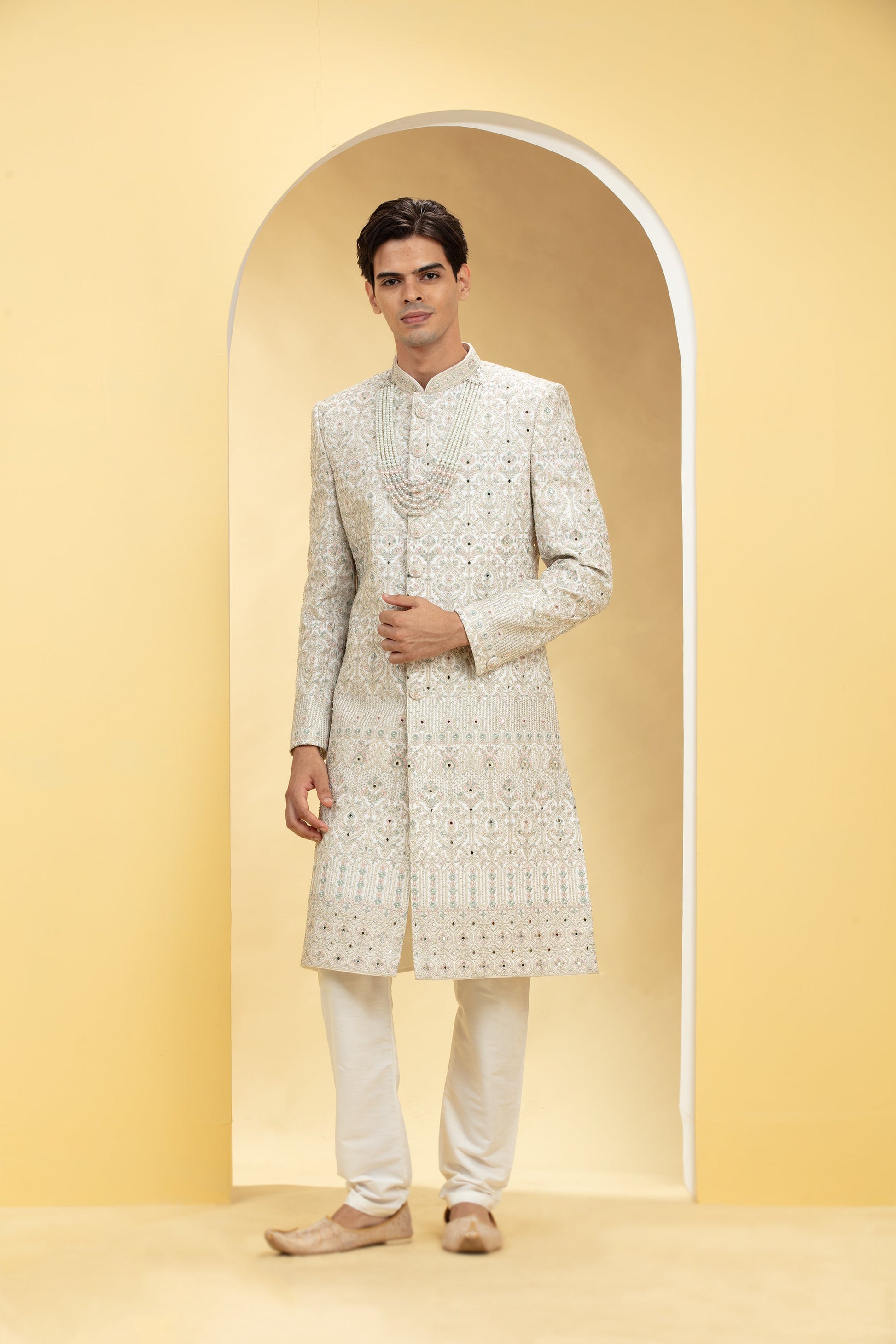 Seashell White Indo Western Sherwani Set with thread work embellishments