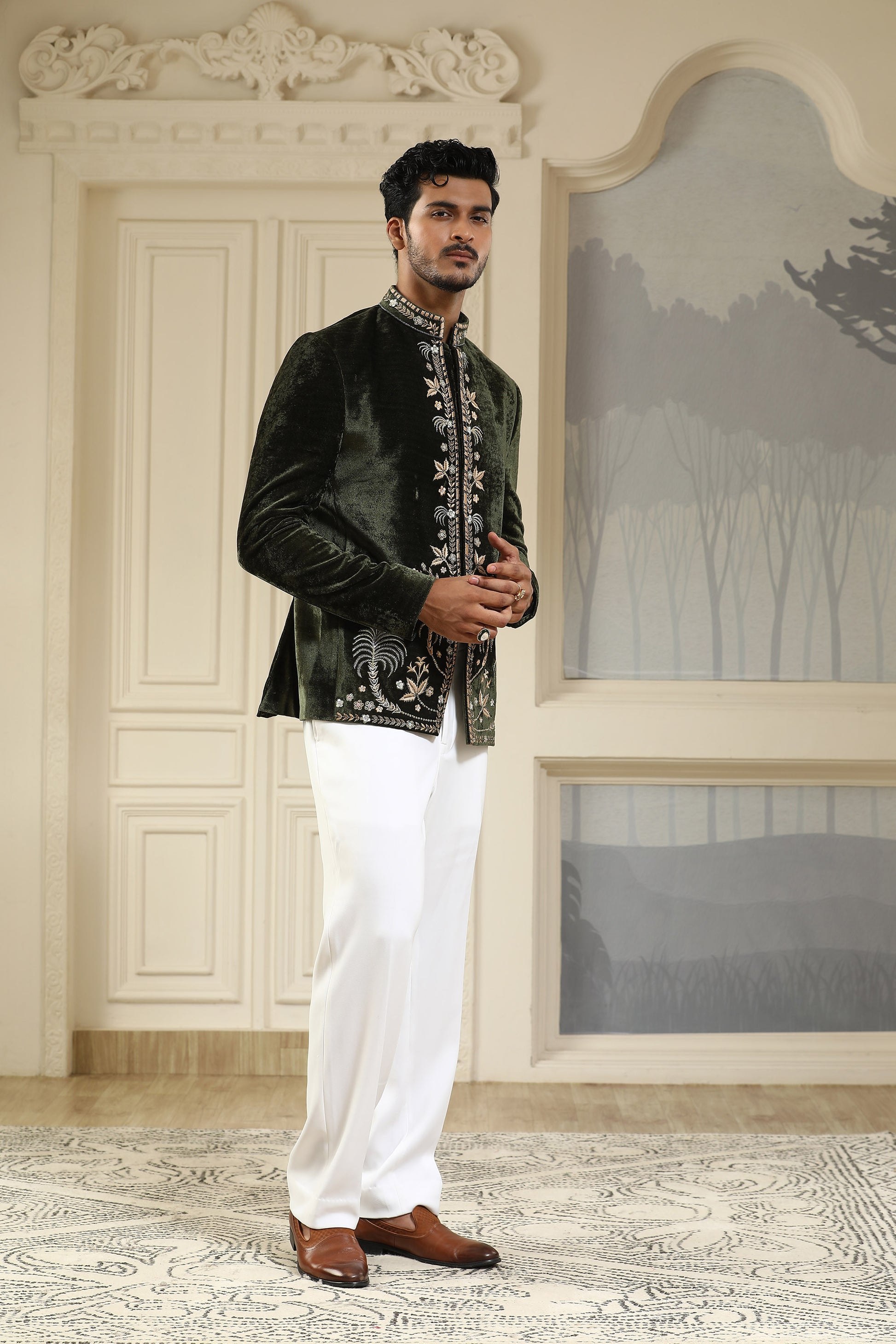 Crafted in plush green velvet, this bandhgala features intricate hand embroidery of palm tree motifs brought to life with resham, katdana, sequins, and fine embellishments. The rich texture and tropical detailing lend it a regal yet refreshing appeal. Paired with crisp white Italian pants, it strikes the perfect balance between opulence and modern flair.