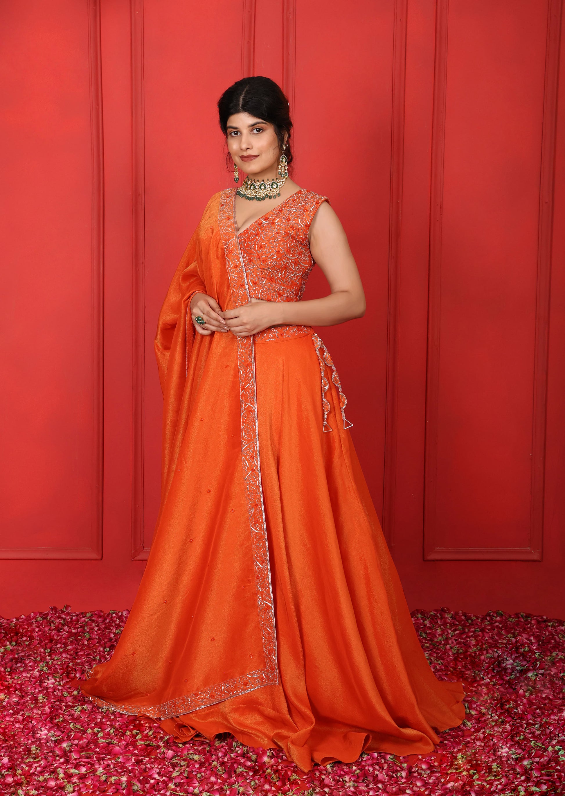 Shocking Orange Hand Embroidered V-Neck Lehenga Set