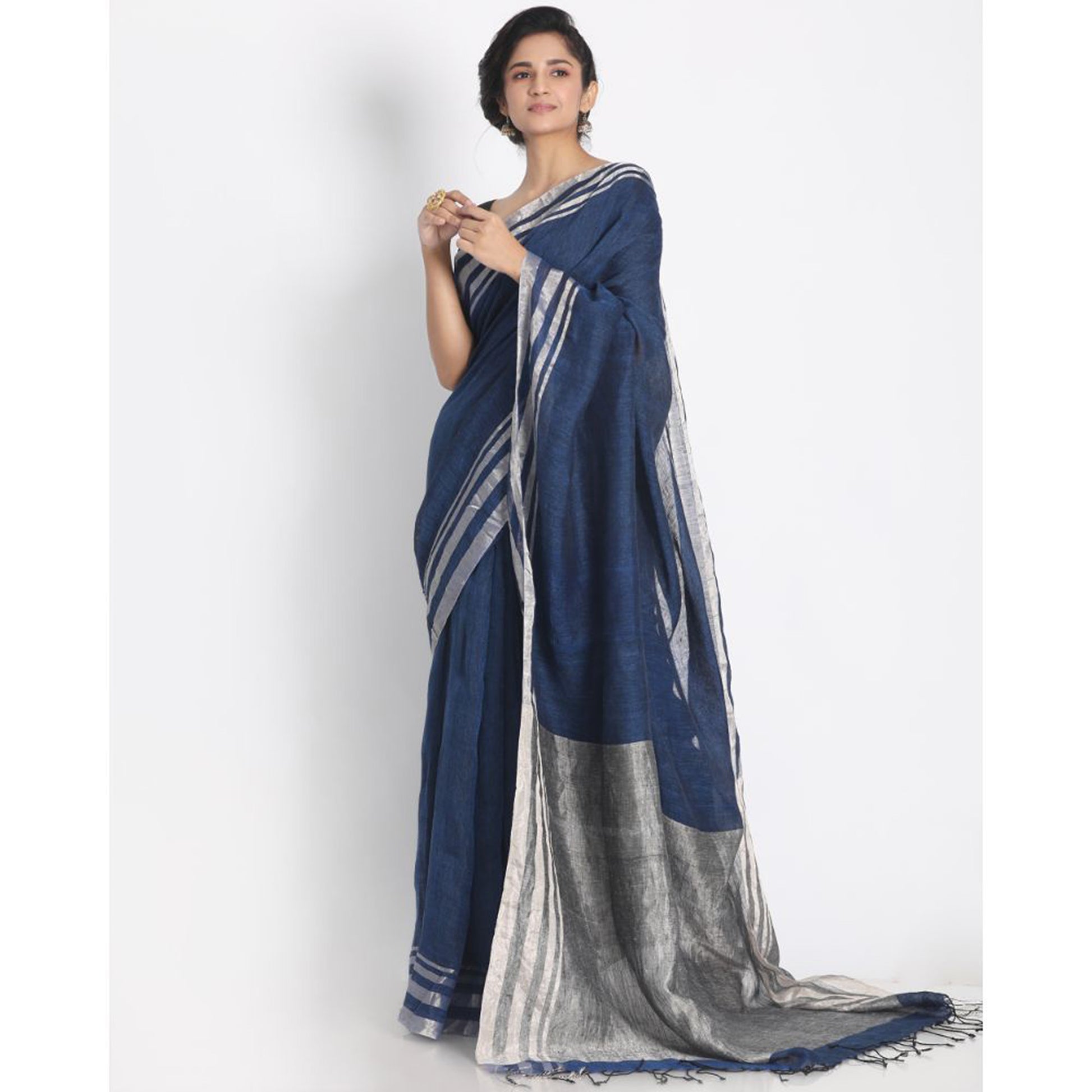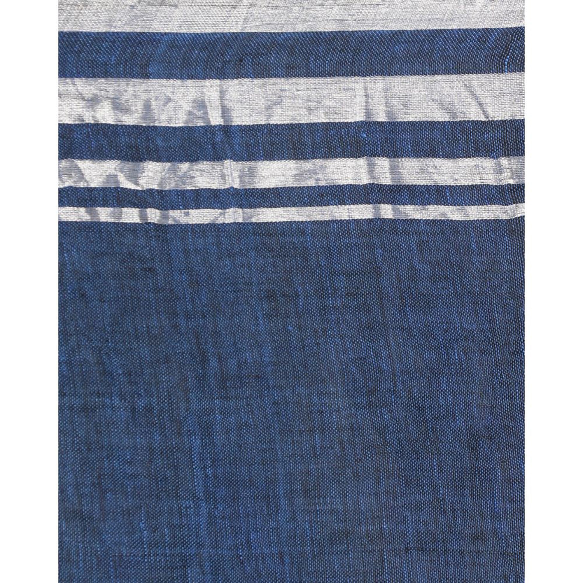 Silver Zari Border Blue Linen Saree