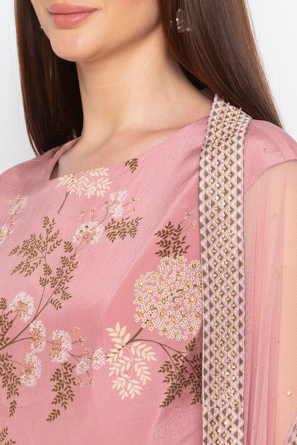Pink Windance Printed Drape Dress With Metal Belt Paired With Net Cape