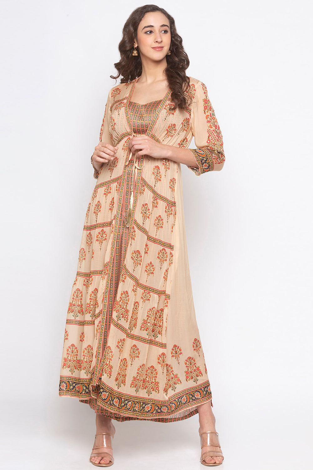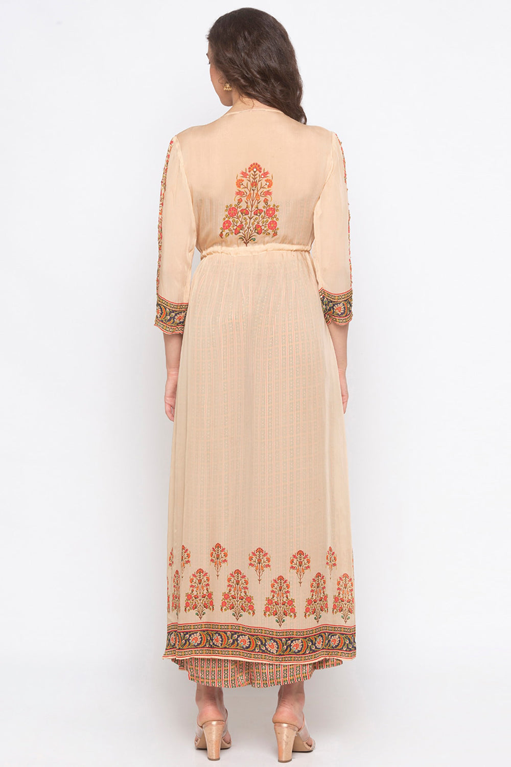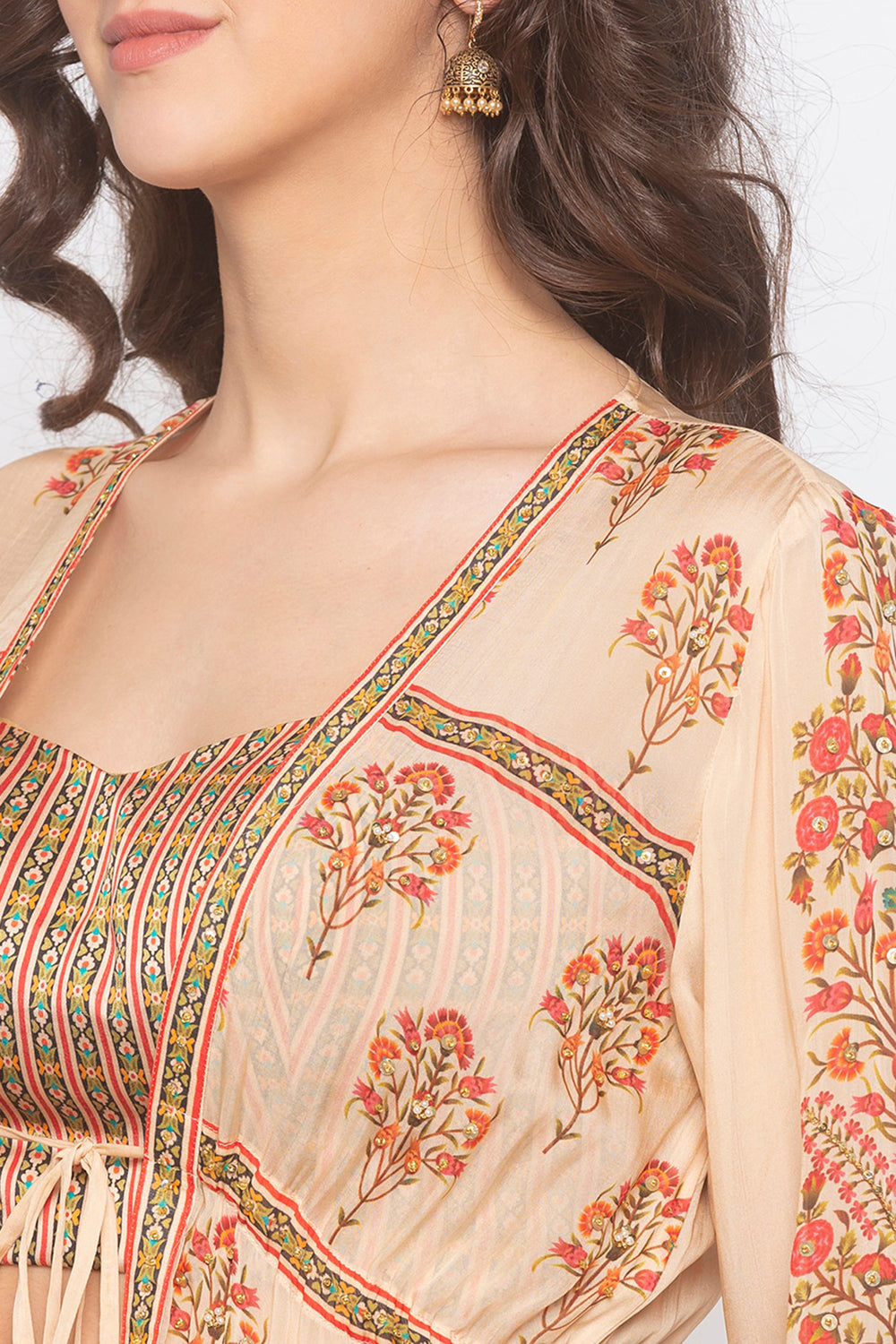 Printed Bustier And Pants Paired With Contrast Layered Prints. Jacket Is Enchance With Gold Embroidery