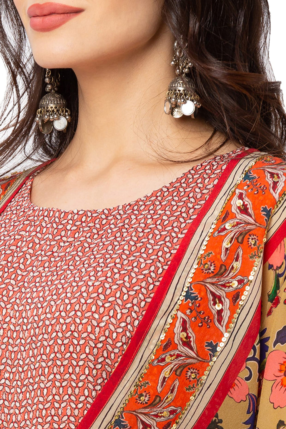 Red Printed Sequin Jumpsuit With Multi Colour Printed Jacket With Waist Tie Up In Chiffon