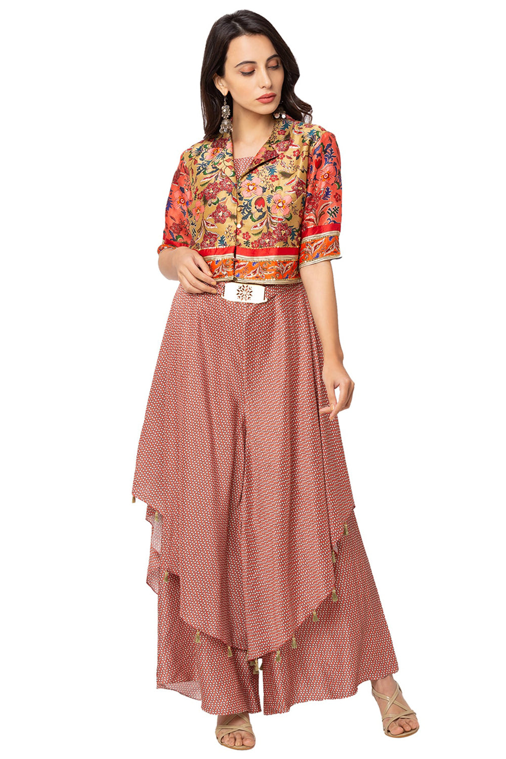 Maroon Printed Double Layer Pant Jumpsuit With Multi Colour Printed Jacket In Silk