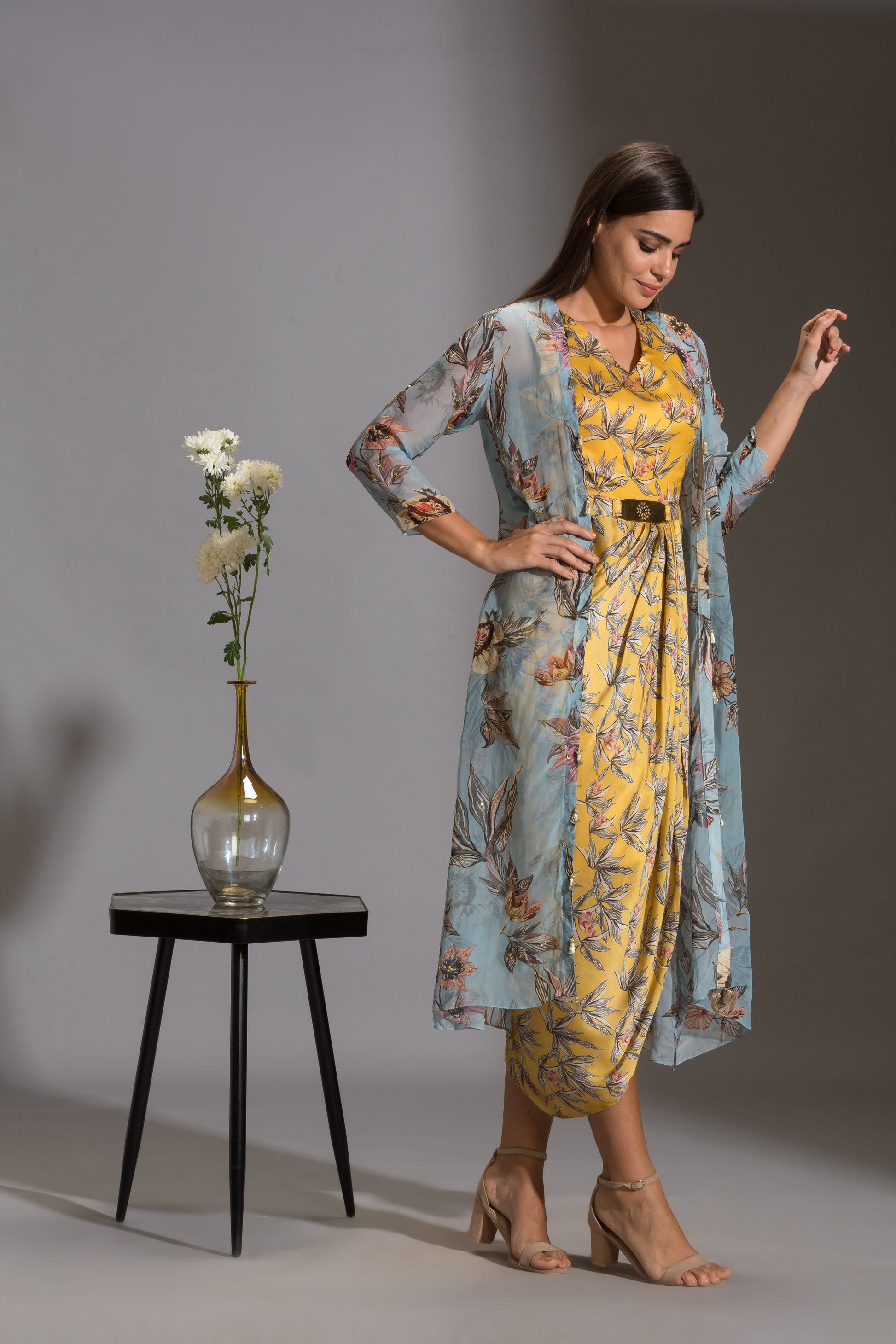 Printed Drape Dress With Side Cuts Paired With Printed Jackets And Tassel Detail
