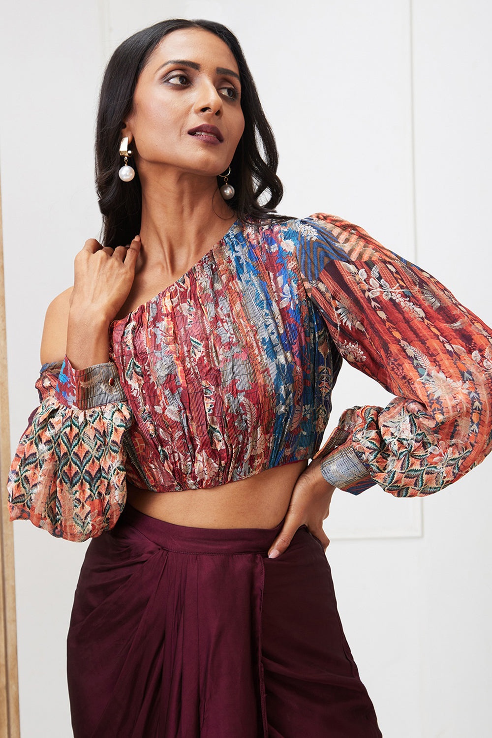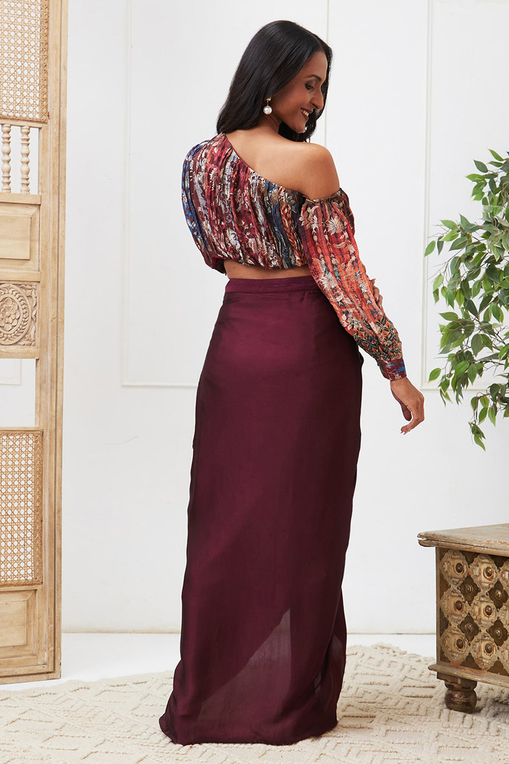 Maroon Adah Printed Crop Top Paired With Drape Skirt In Crepe.