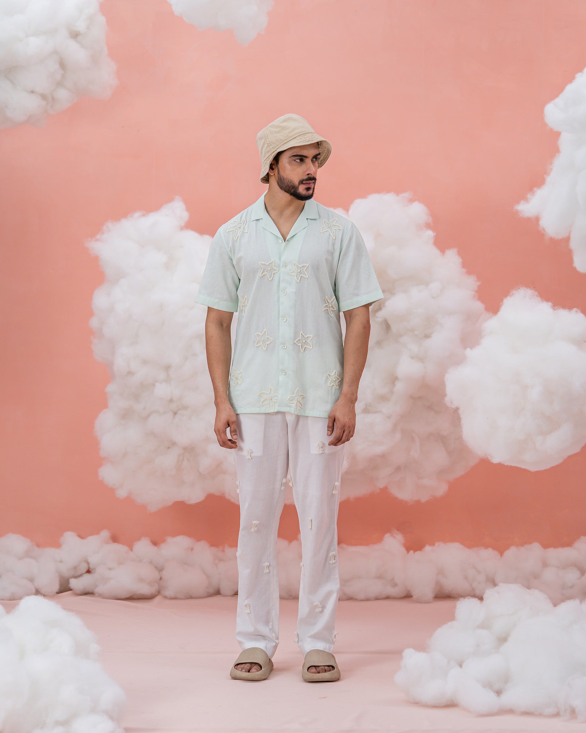 Handcrafted in hand-dyed Light Mint Linen Cotton, this shirt is an adornment of Starfish Motifs, delicately accented by shimmering white beads and pearls. It channels the tranquil Beauty of the coast offering a balance of breeziness and a subtle glimmer.