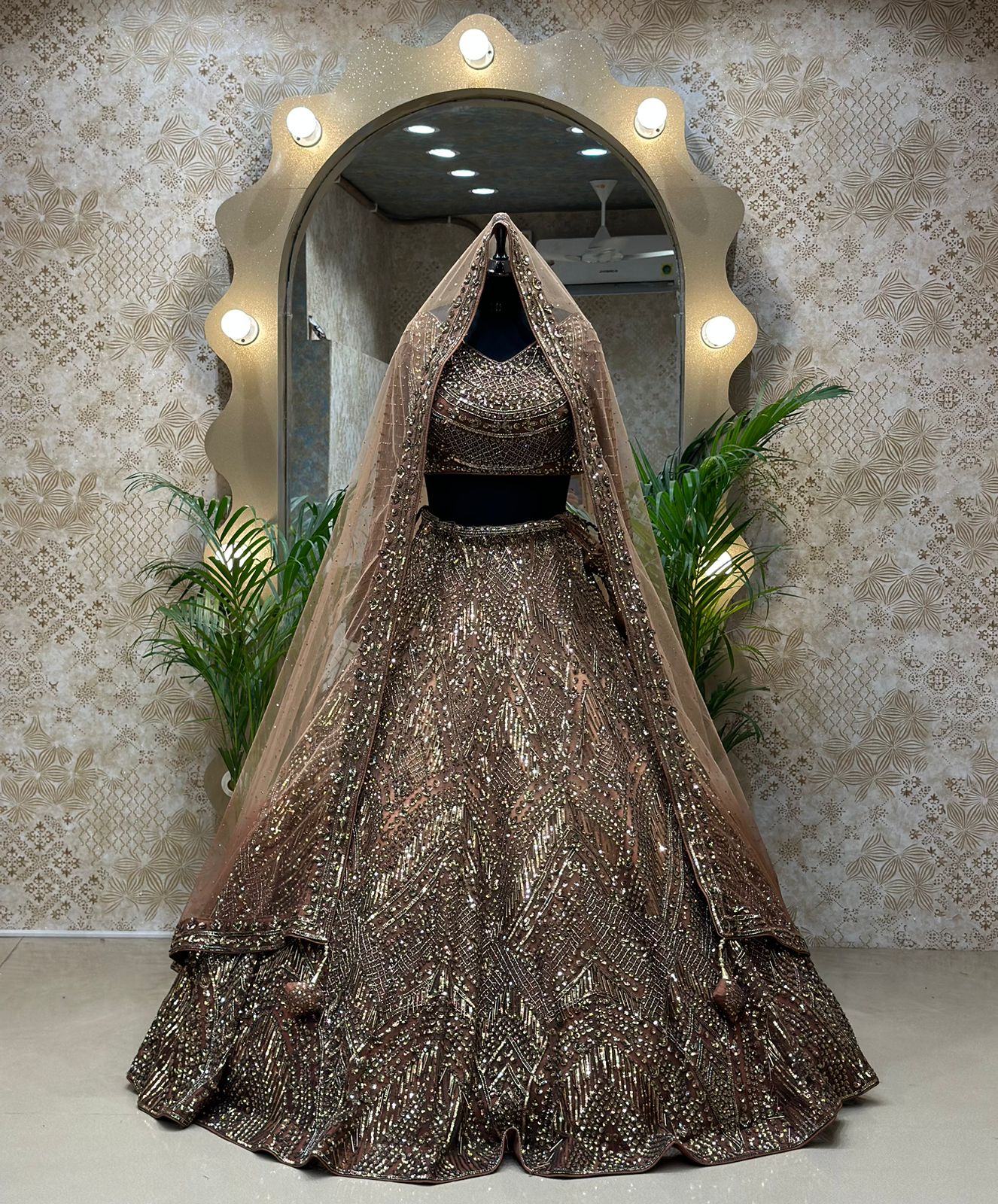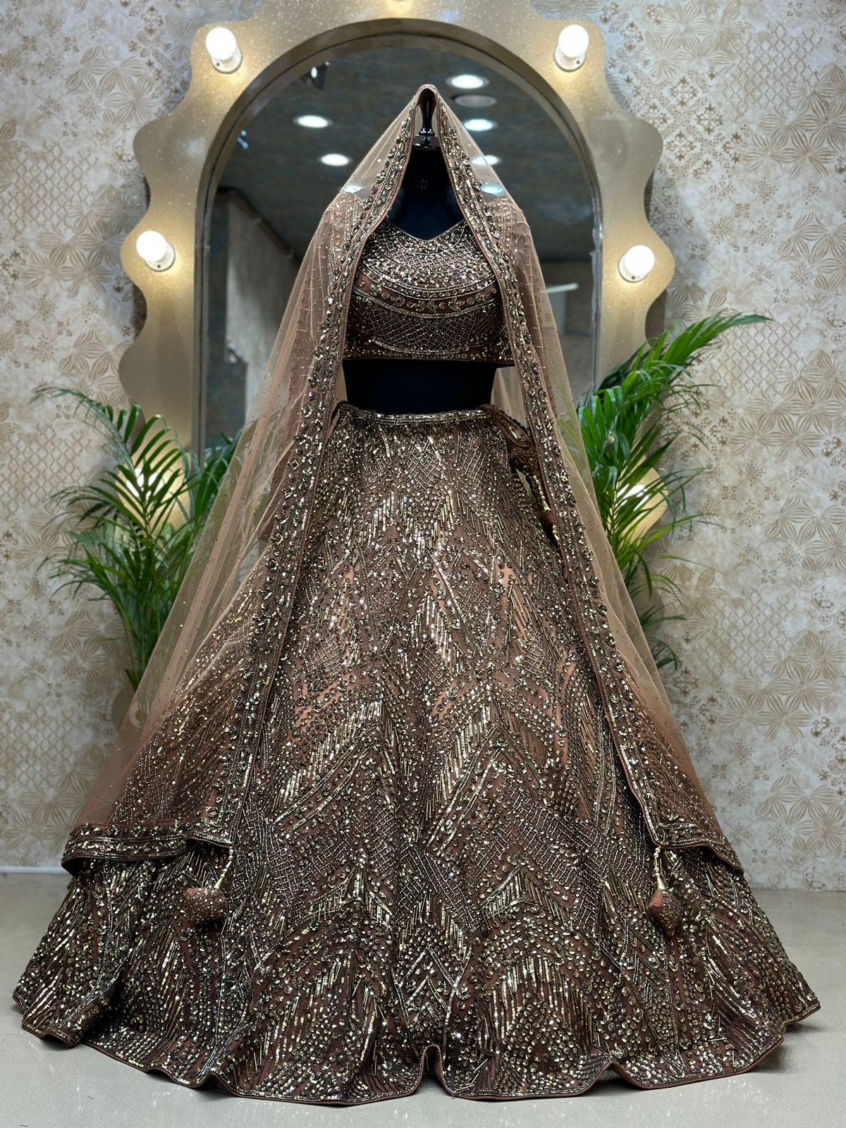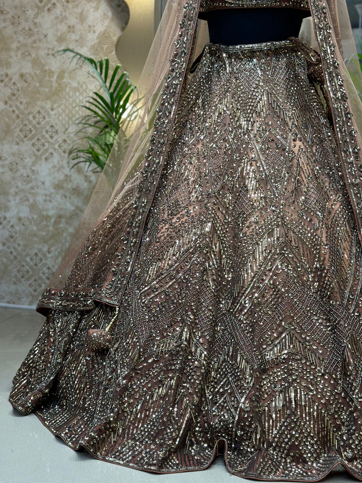 Tan Net Hand Embroidered Pearl Work Bridal Lehenga