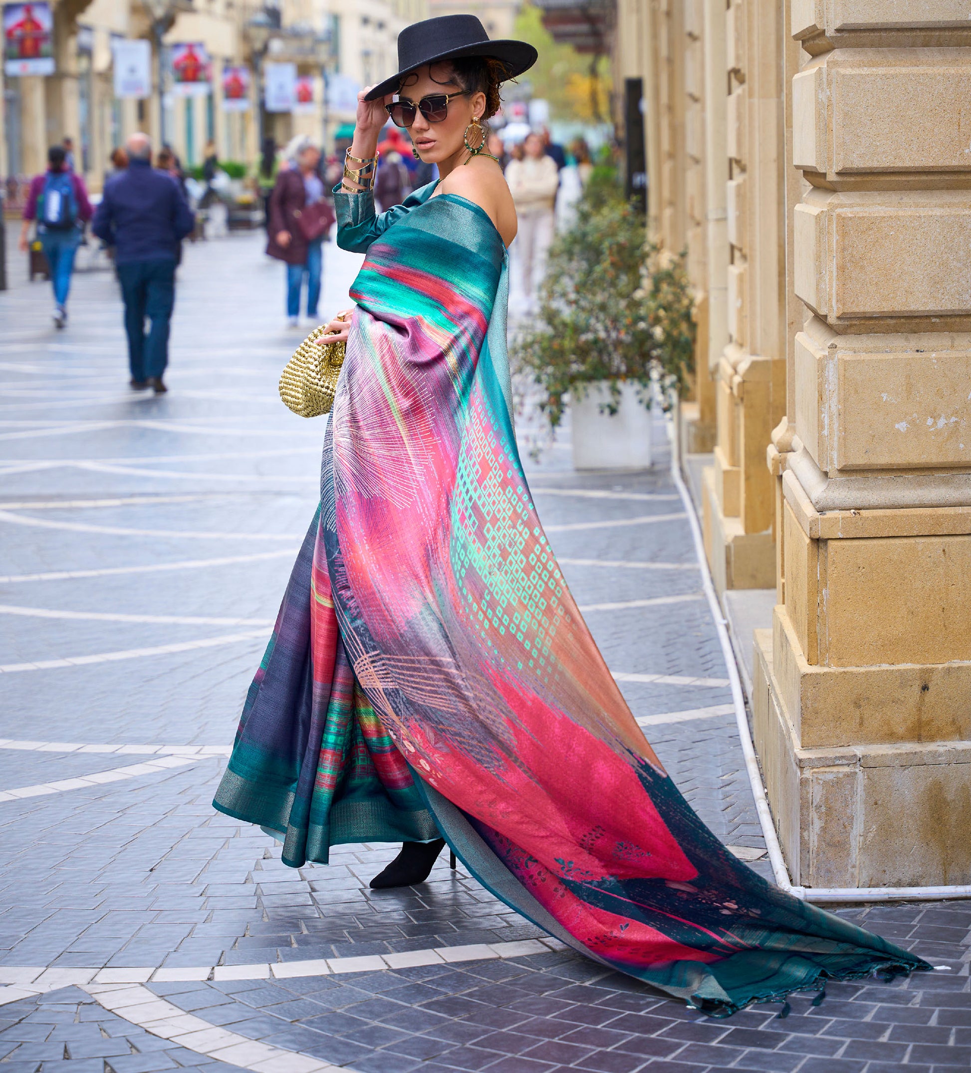 Teal Black Multi Color Kopper Pure Gaji Silk Handloom Saree