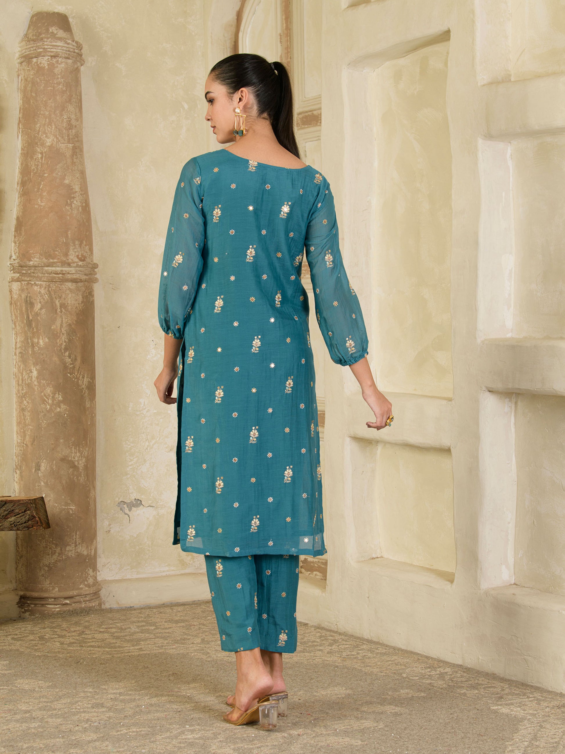 Teal Blue Embroidered Chanderi Kurta with Pants ( Set of 2 )