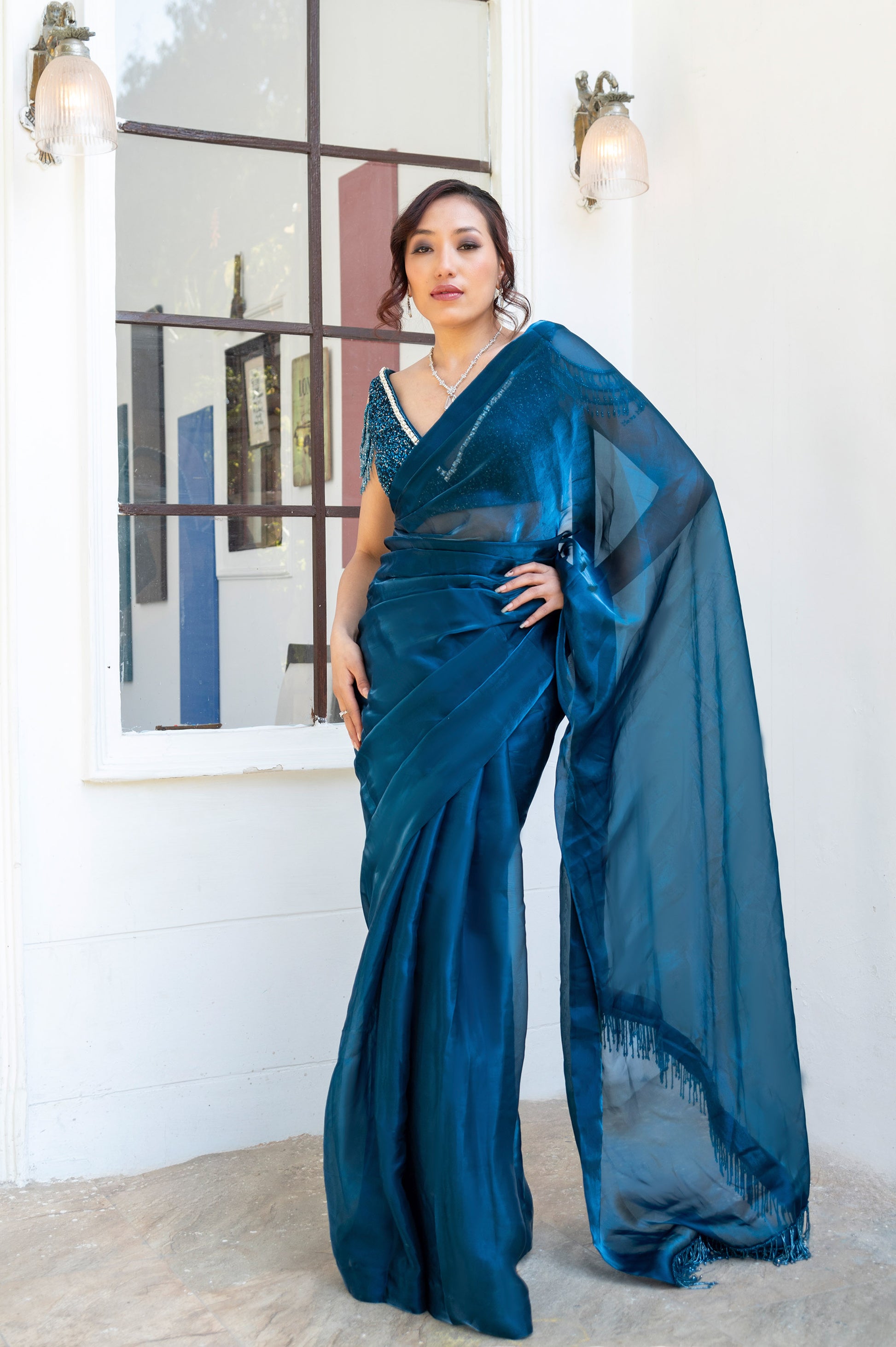 A deep teal glass organza saree paired with a hand-embellished blouse featuring delicate beaded fringe details.