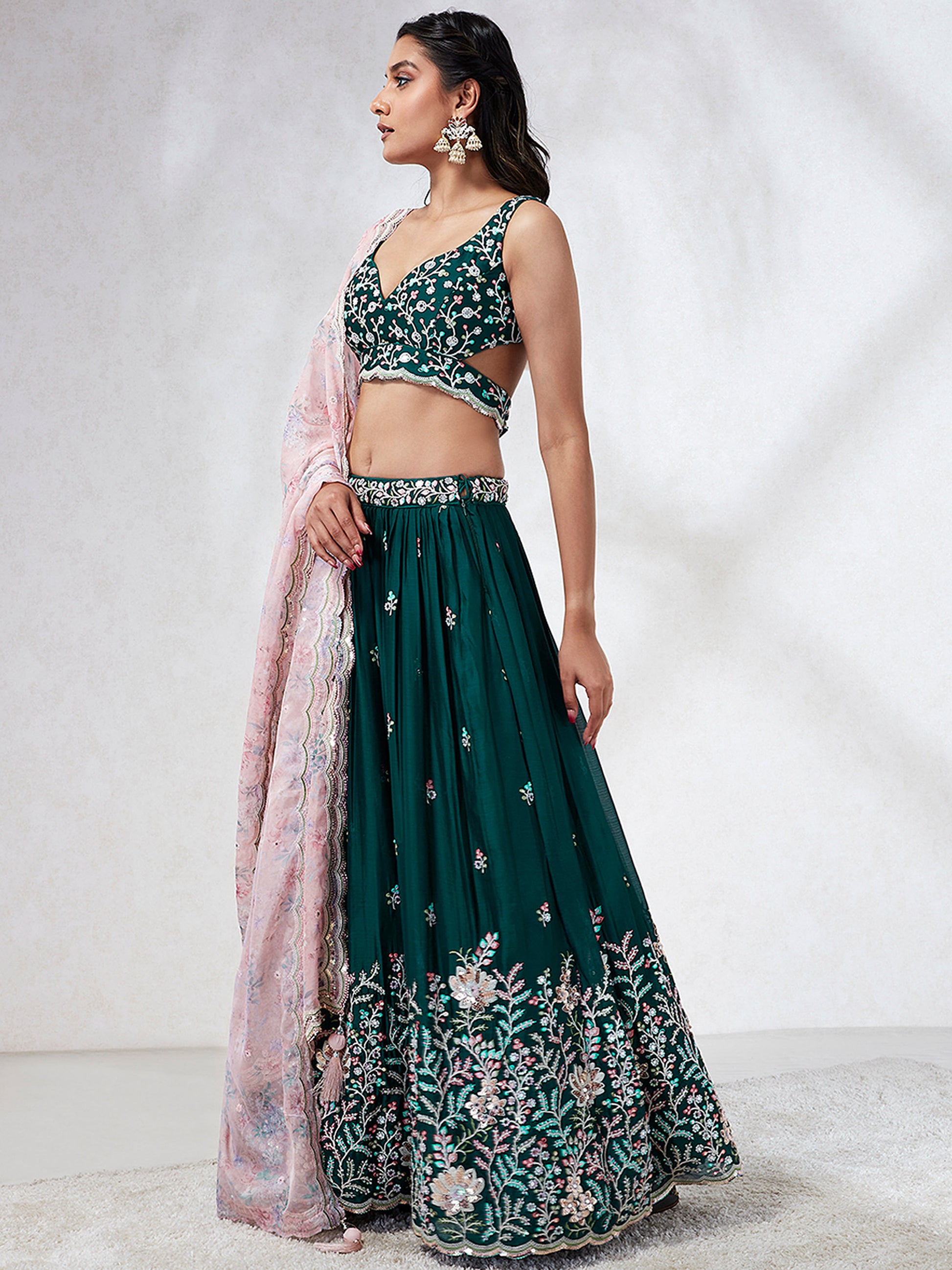 Teal - Georgette Sequins, Mirror and thread embroidery Lehenga choli