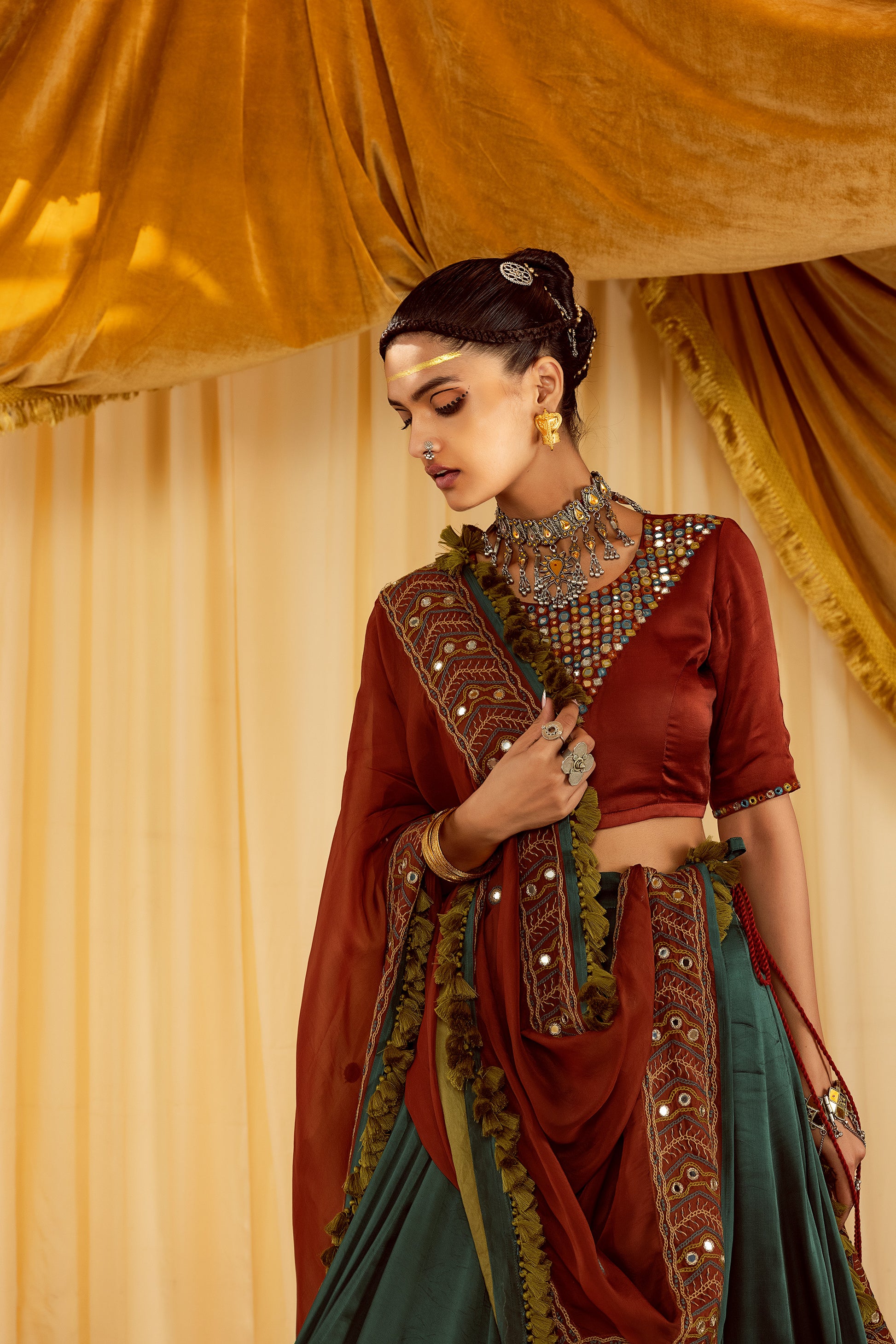 This set is a handcrafted Lehenga choli that features mirror work on the Lehenga & the choli. The Lehenga has contrast & print borders. The duppatta of the set is a statement that features our signature hand embroidery with tassel details.