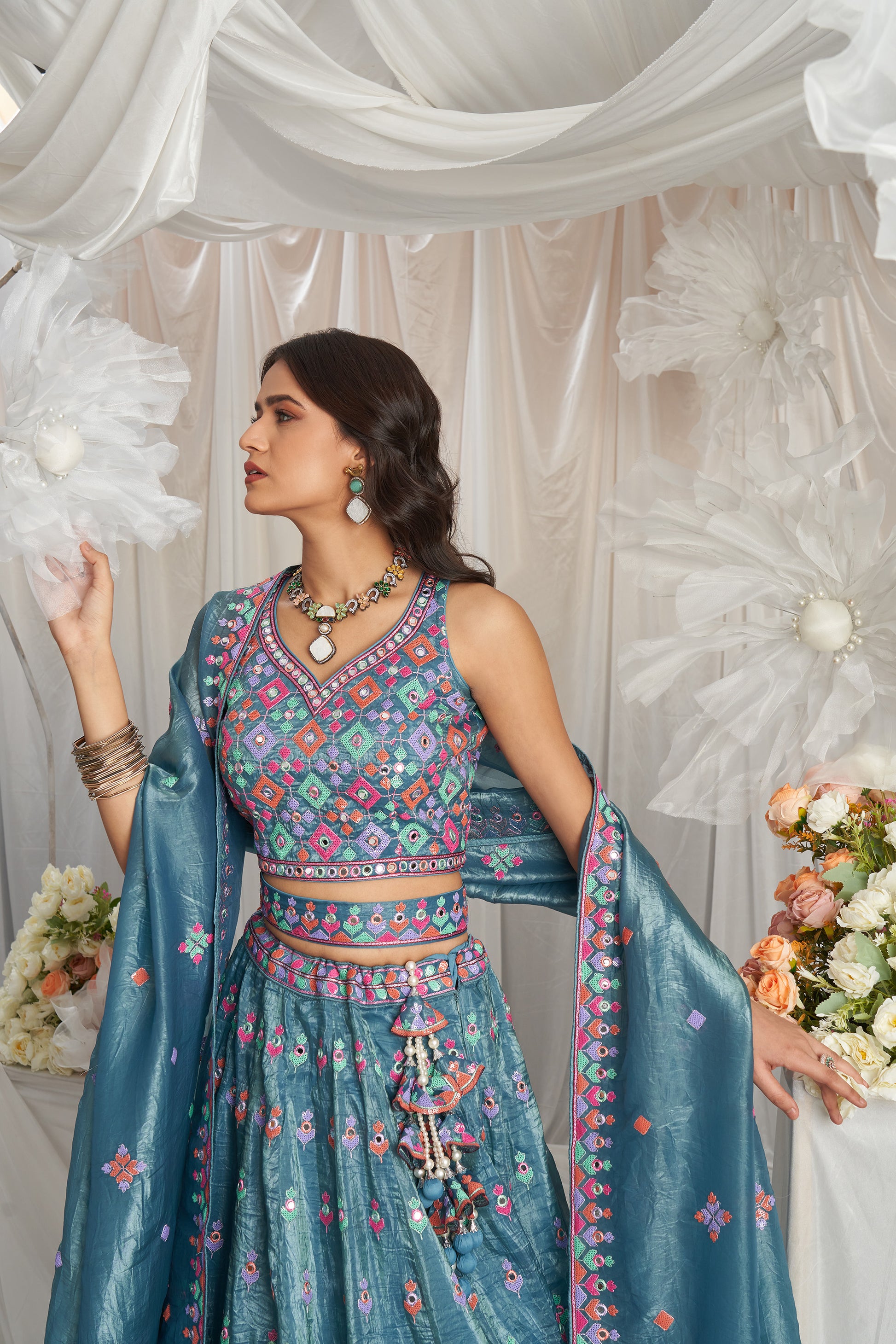 Teal Organza Sequins and Mirror embroidery Designer Lehenga choli & Dupatta