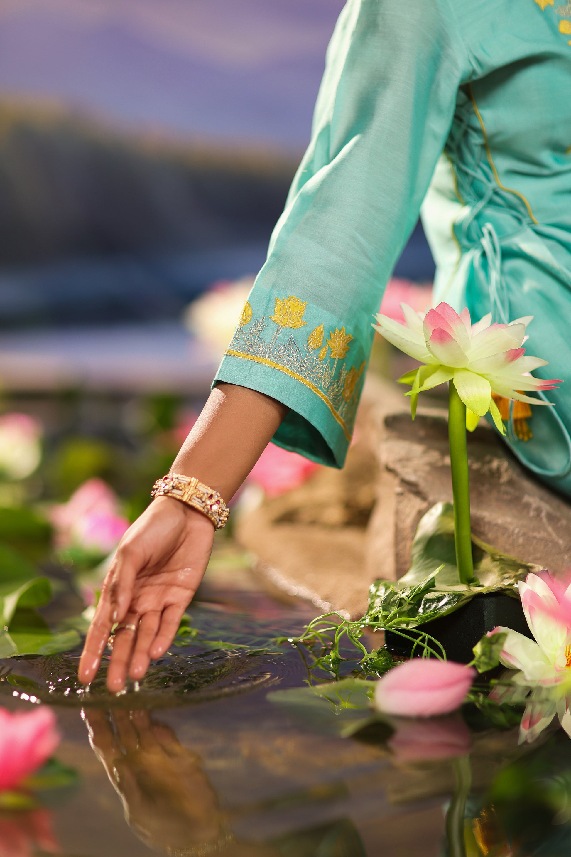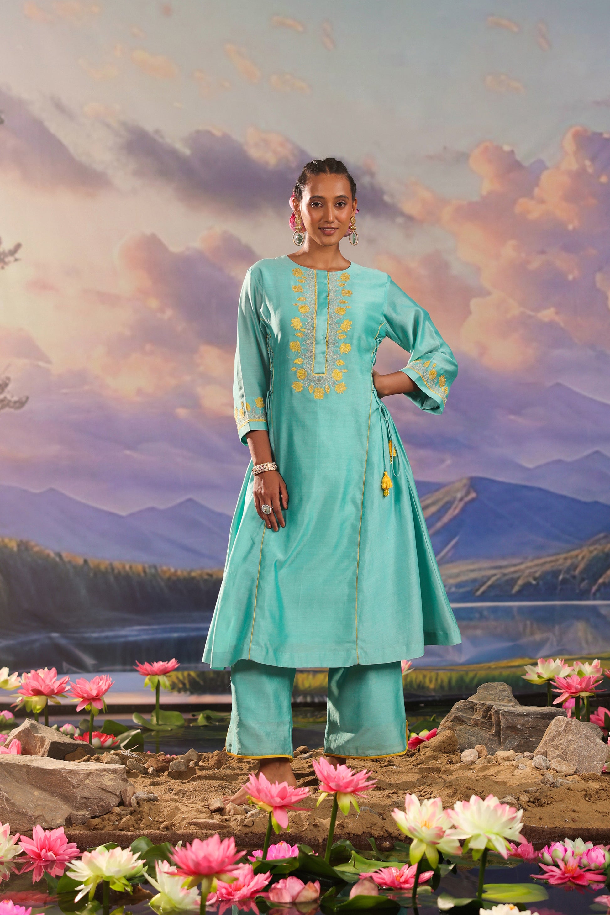 Our elegant and chic turquoise blue silk Chanderi suit set features yellow lotus appliqué on the kurta, accentuated with delicate side ties. The palazzo has stylish side slits, adding a modern flair to this timeless ensemble.
