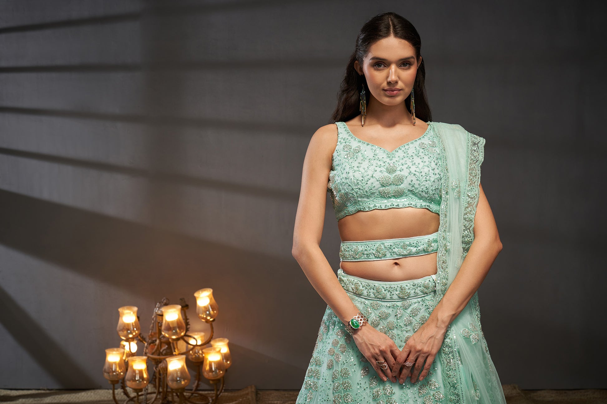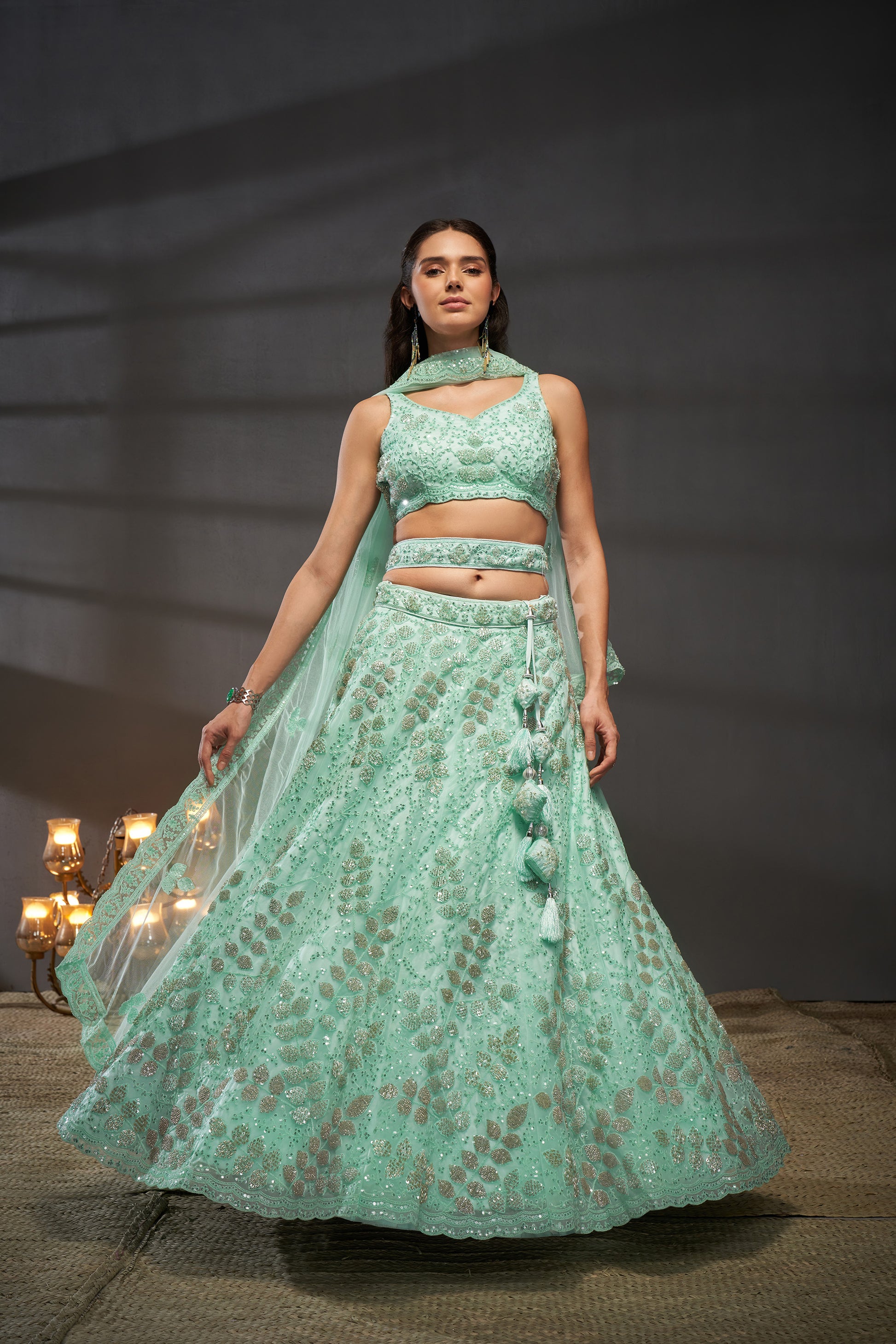 Turquoise blue Net Cutdana, Sequins and Zarkan embroidery Lehenga