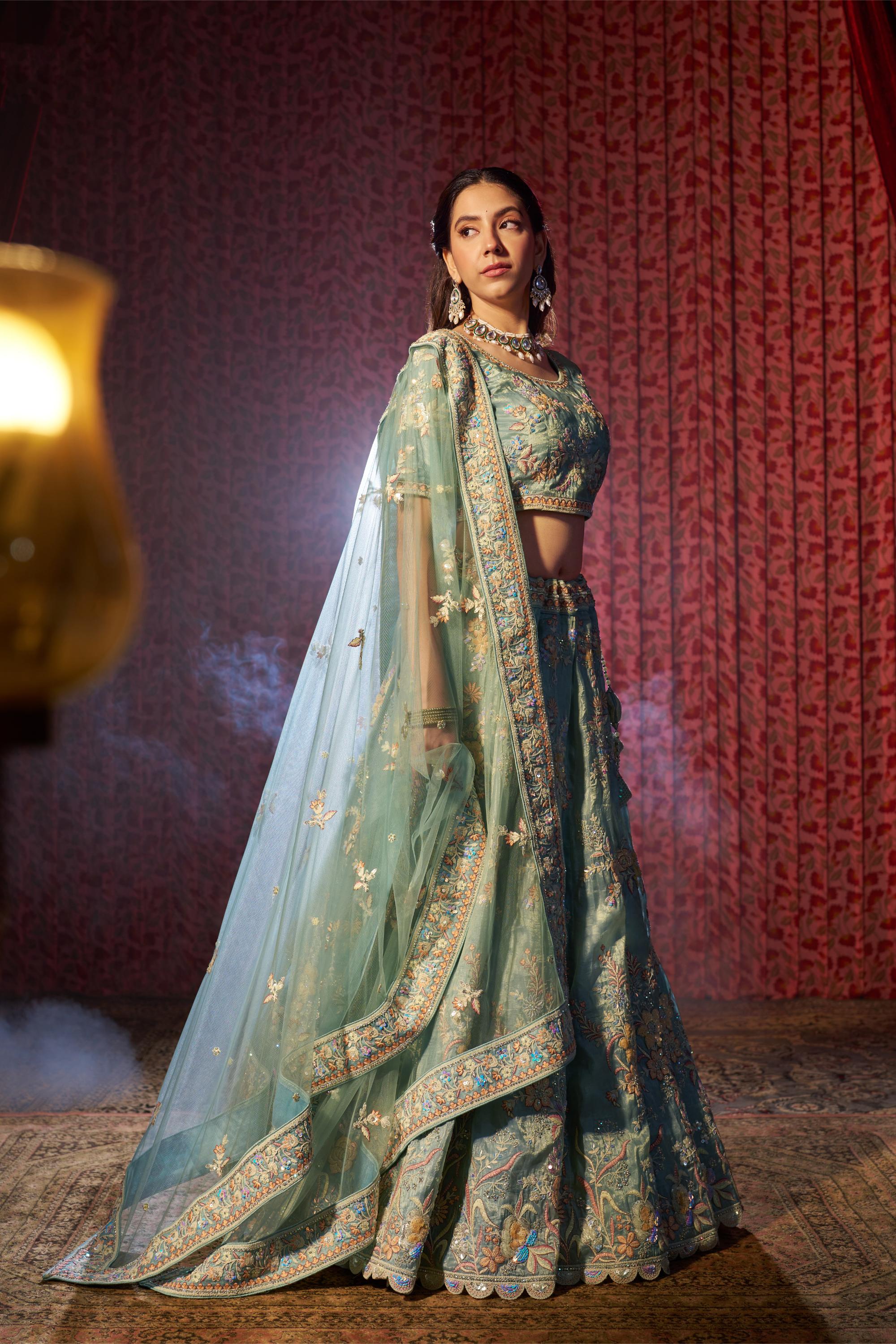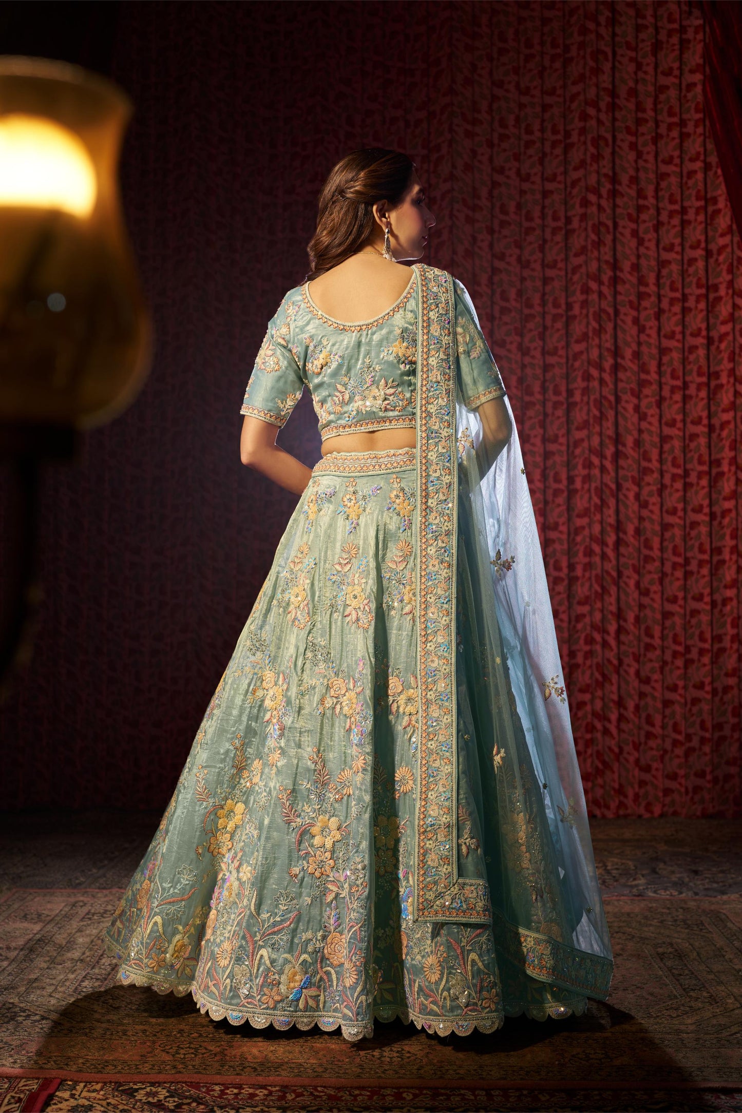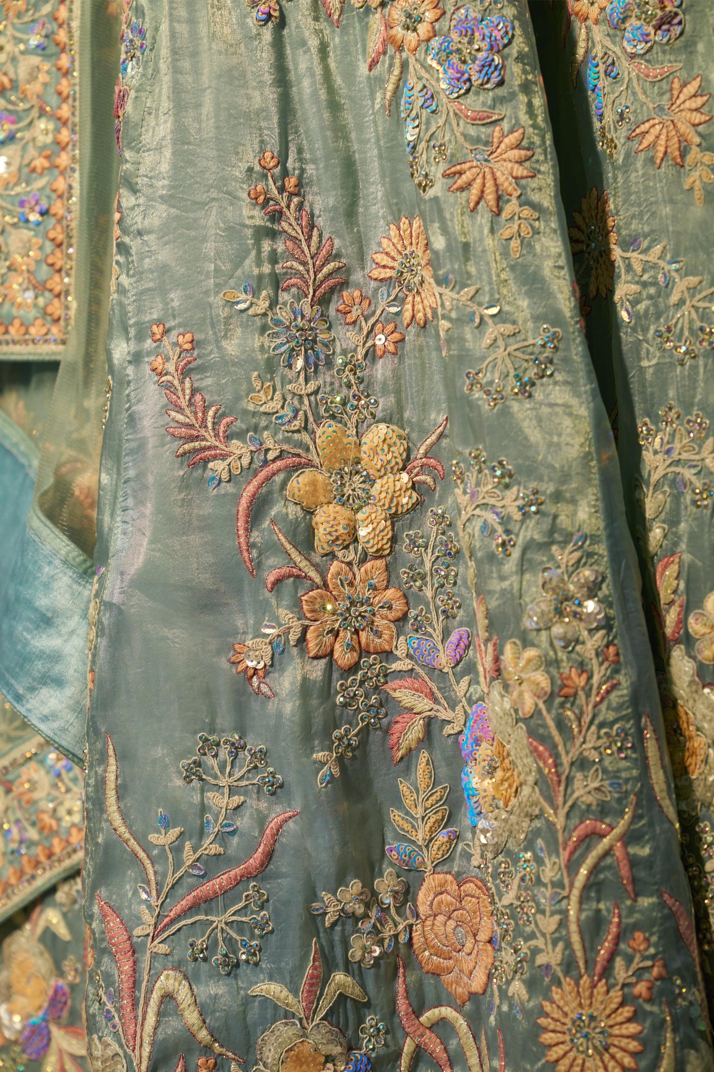 Turquoise Organza Zari & Dori Embroidered Sangeet Lehenga