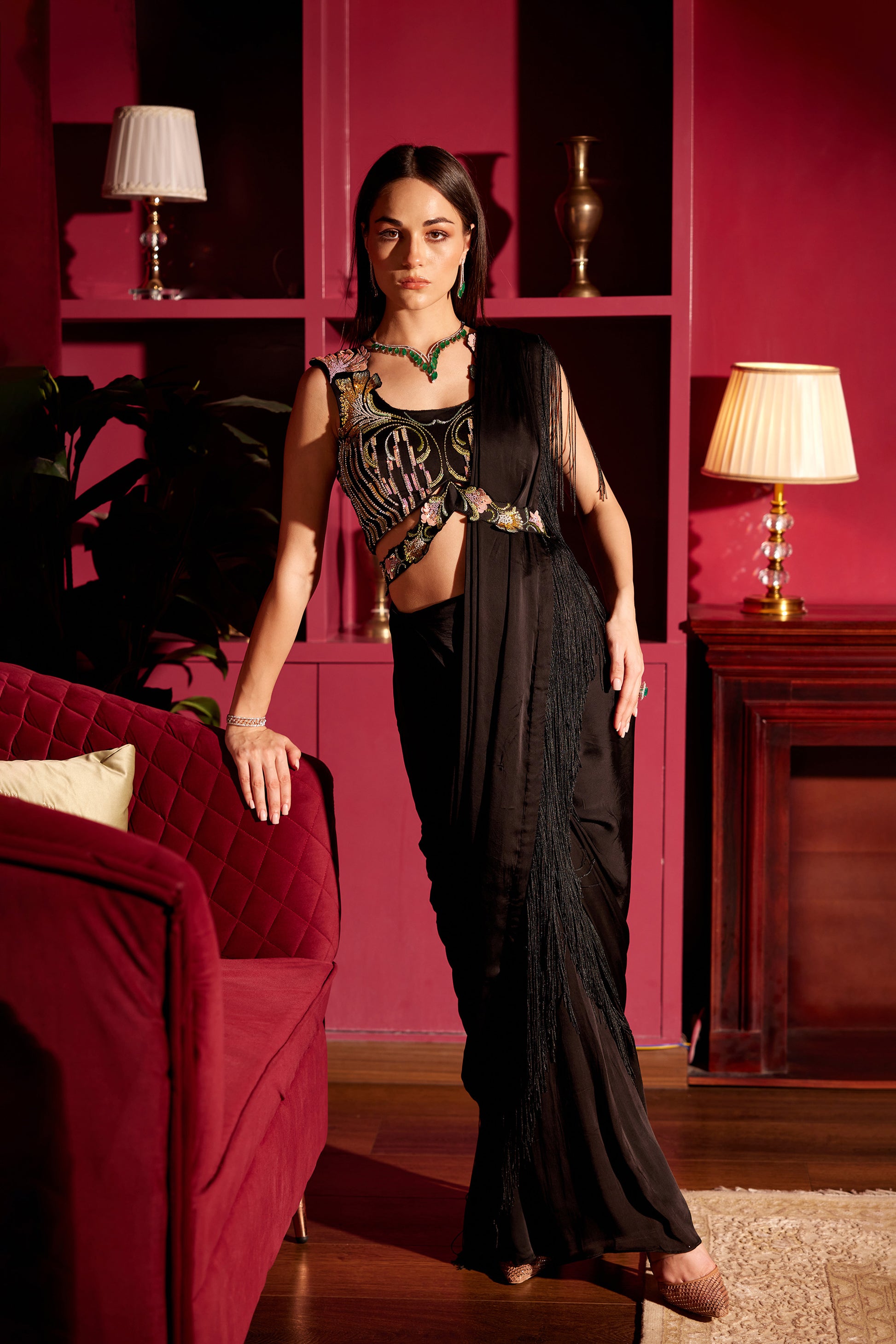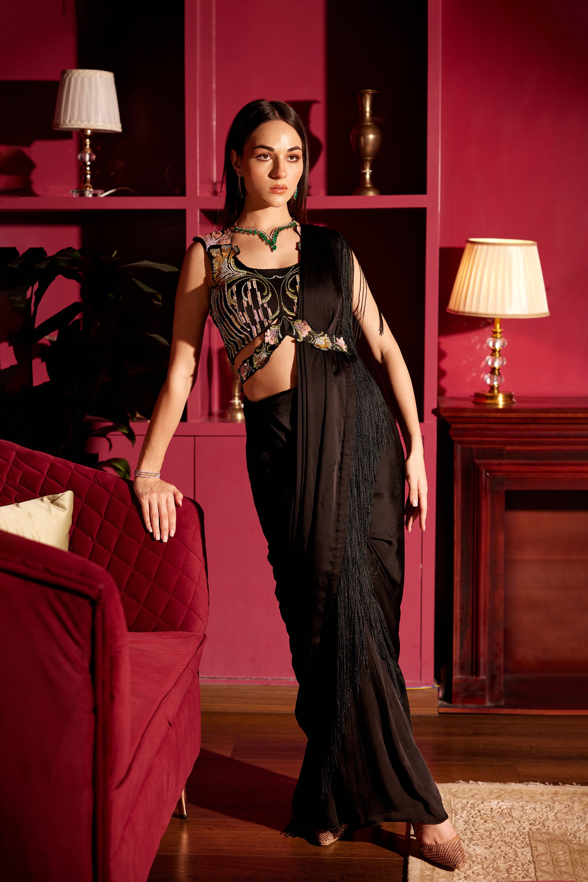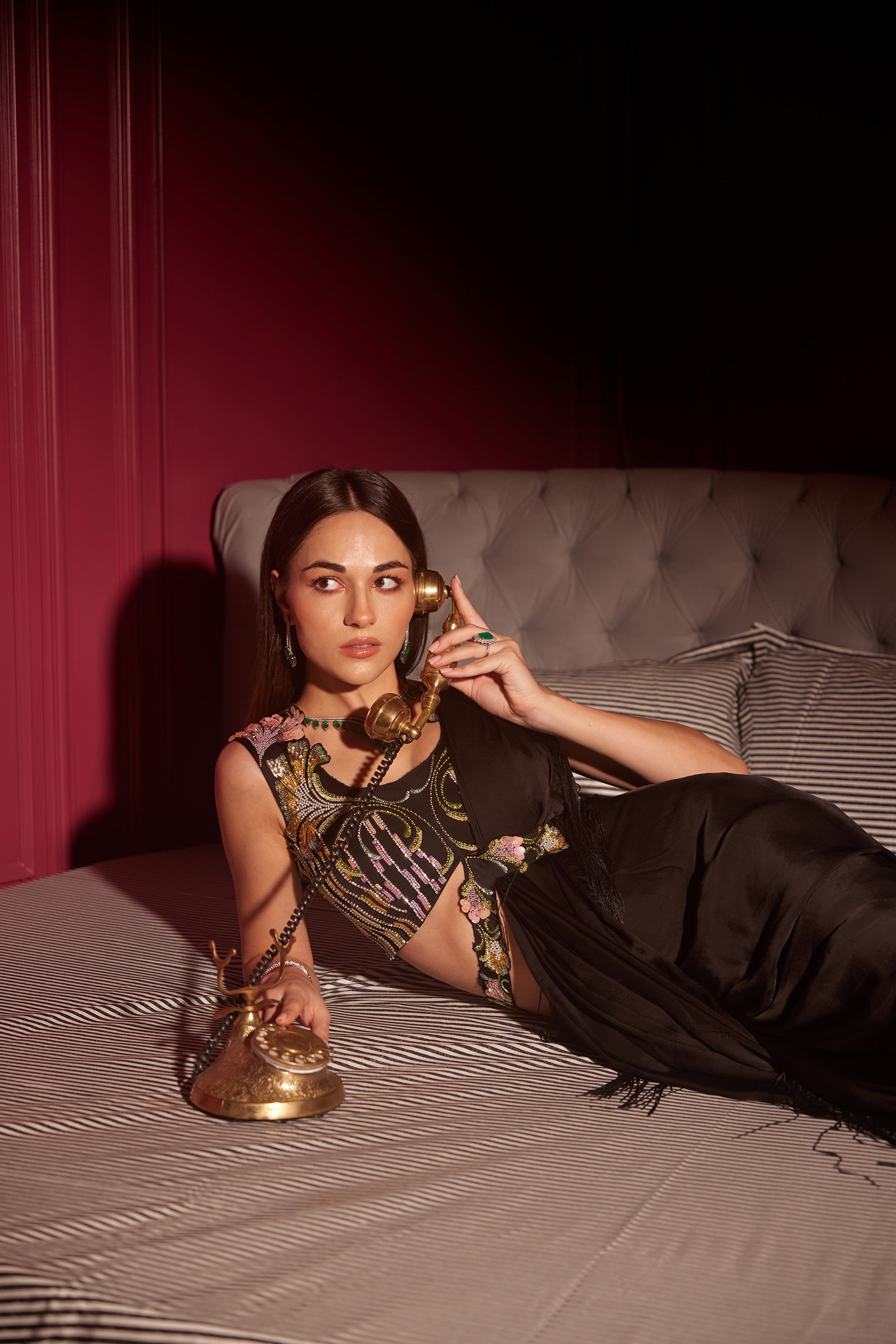"The garment showcases a stunning array of embellishments: from shimmering cutdana and lustrous pearls to intricate beadwork, silver accents, and sparkling diamond-like stones. Delicate chains intertwine with the design, adding a touch of elegance, while a holographic finish lends a modern, ethereal quality. Together, these elements form a meticulously crafted tapestry of texture and shine, enhancing the garment with exquisite detailing.