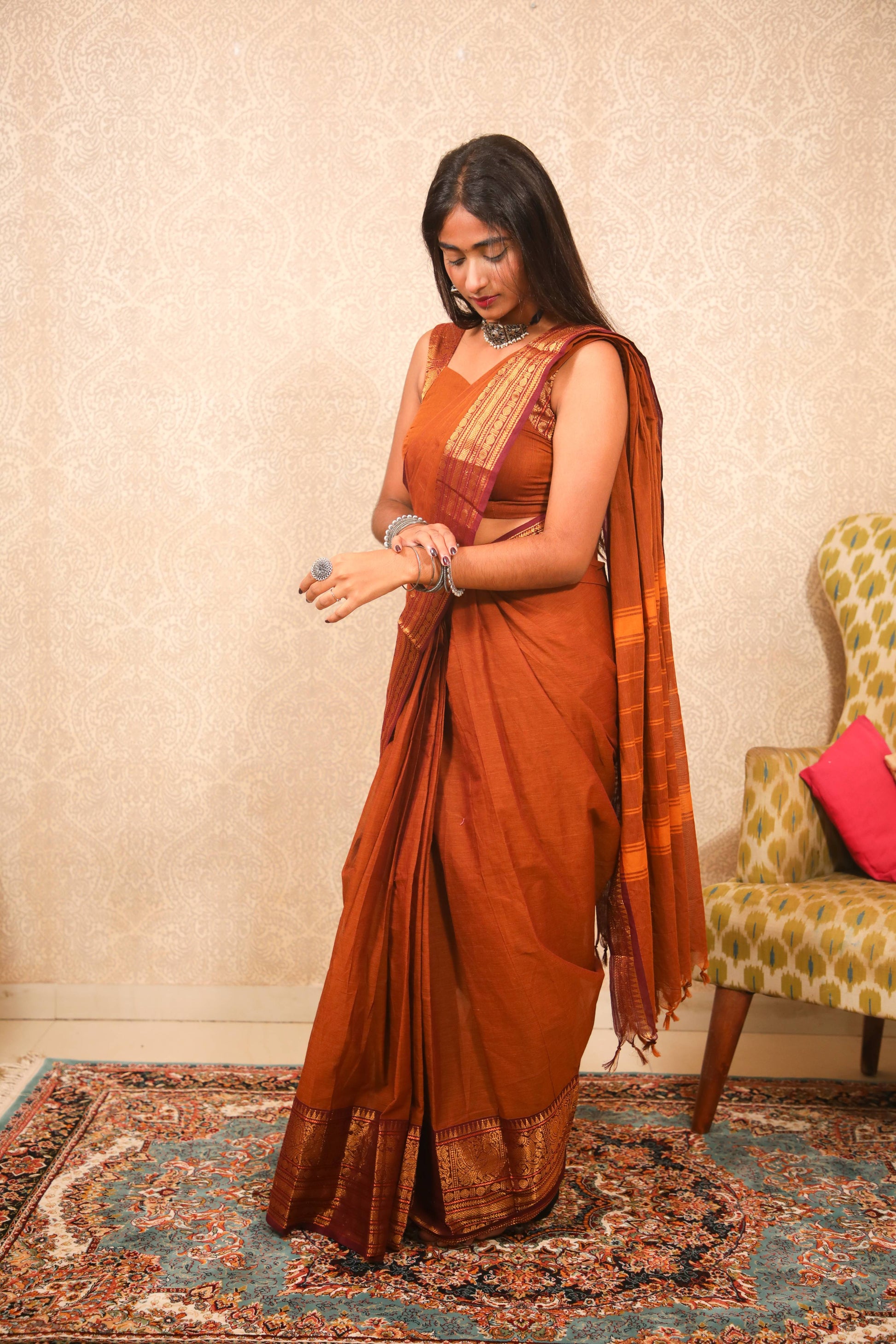 Varnam - 1 minute Ready-to-wear saree in Brown color in Kanchi Cotton