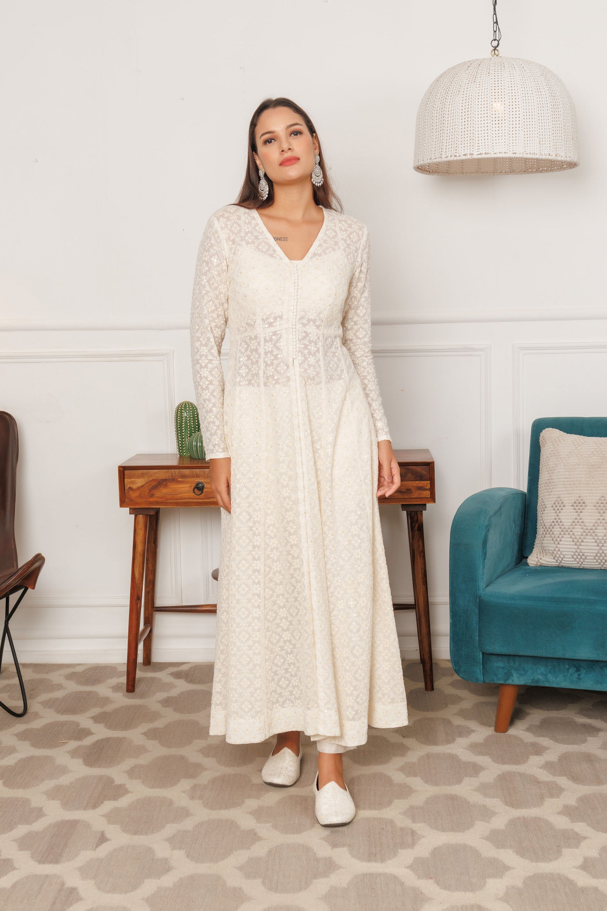 Embody elegance in our embroidered georgette cape set. The sheer georgette lends an air of delicacy, making this look understated yet elegant. Elevated with tonal thread work and paired with pure silk chanderi tube top and pants. *Embroidery design may vary from original photo according to availability.