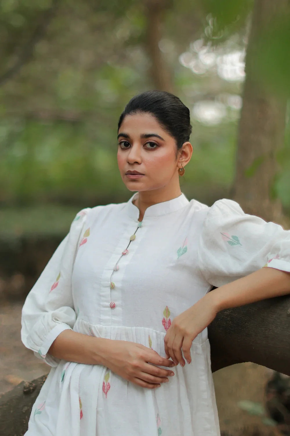 Crafted from handwoven pure cotton, this White Flared Jamdani Dress features a flat collar neck and woven multi-color leaves, adding a touch of nature-inspired elegance. With a comfortable lining and a stylish side slit, it’s perfect for effortless movement and charm. Ideal for both casual and semi-formal settings, this dress combines heritage craftsmanship with modern flair.