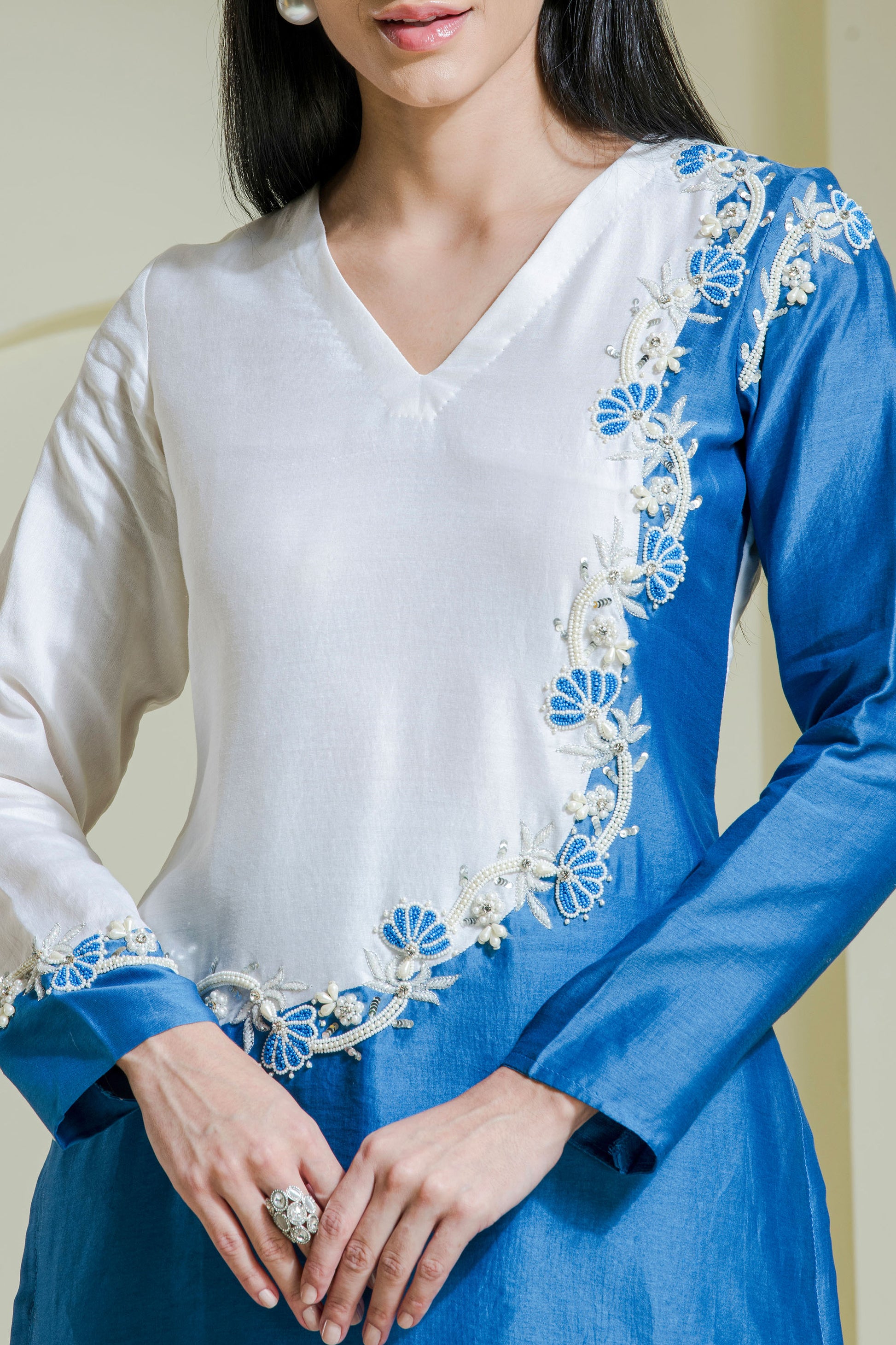 Exude timeless grace in our white and blue chanderi kurta set perfect for any festivities.The kurta set is made with chanderi silk fabric,embellished with sequins,beads and glass beads hand embroidered floral pattern.