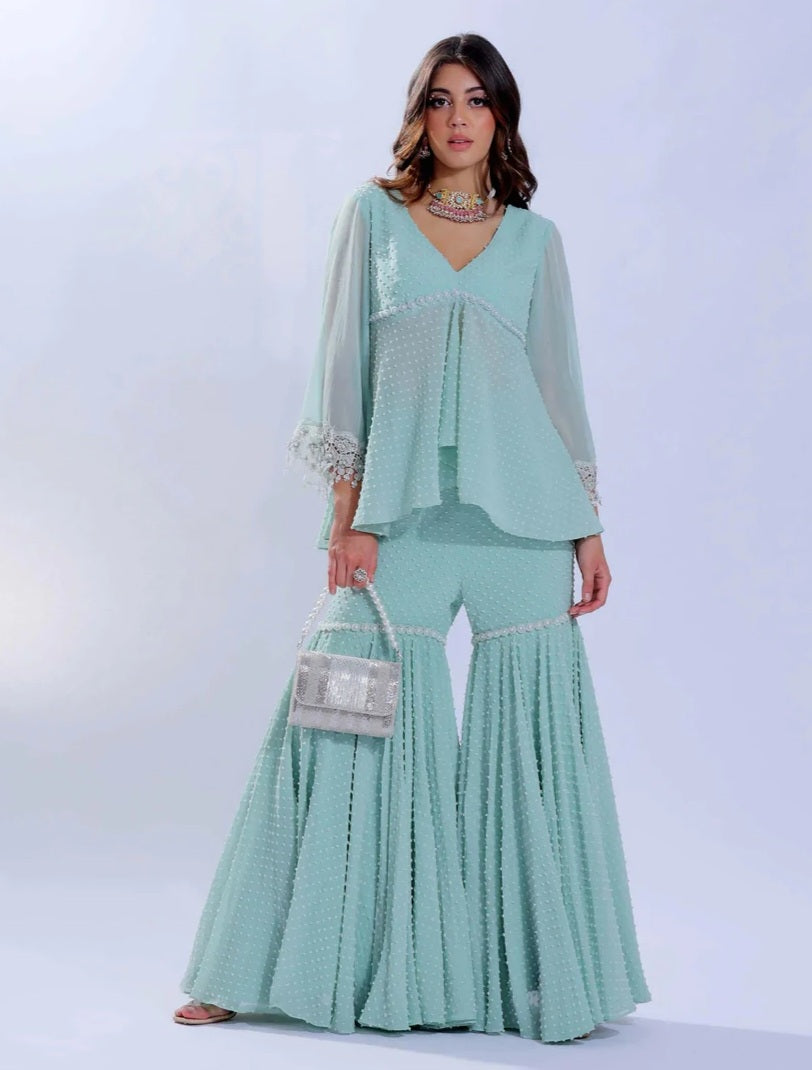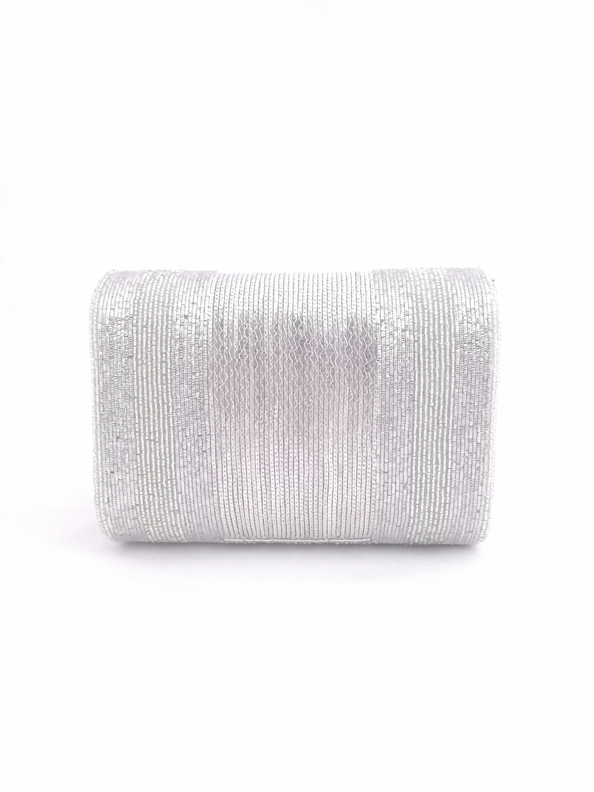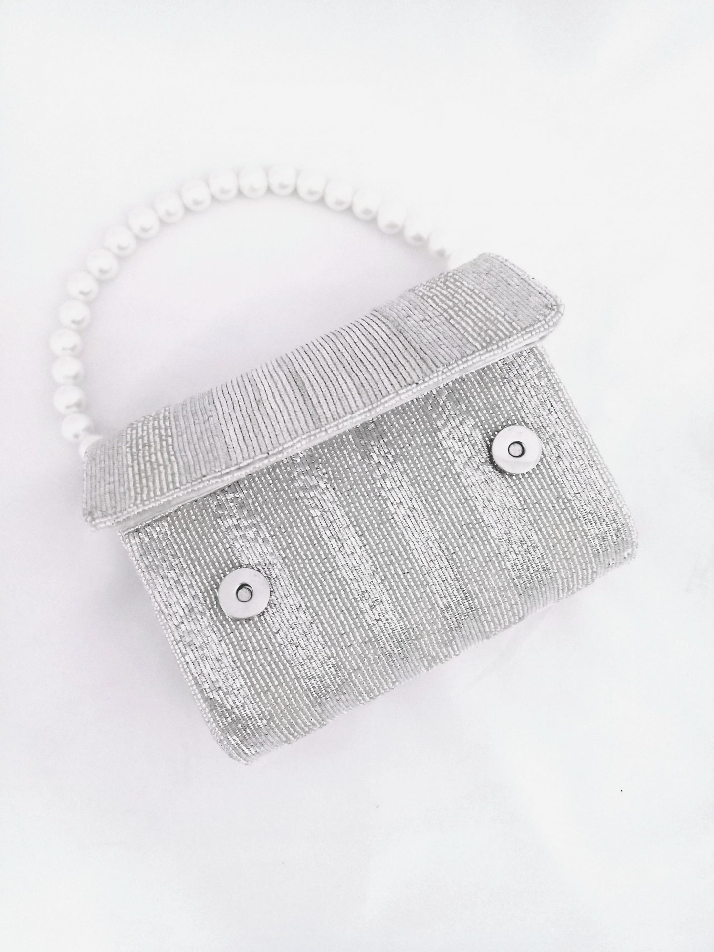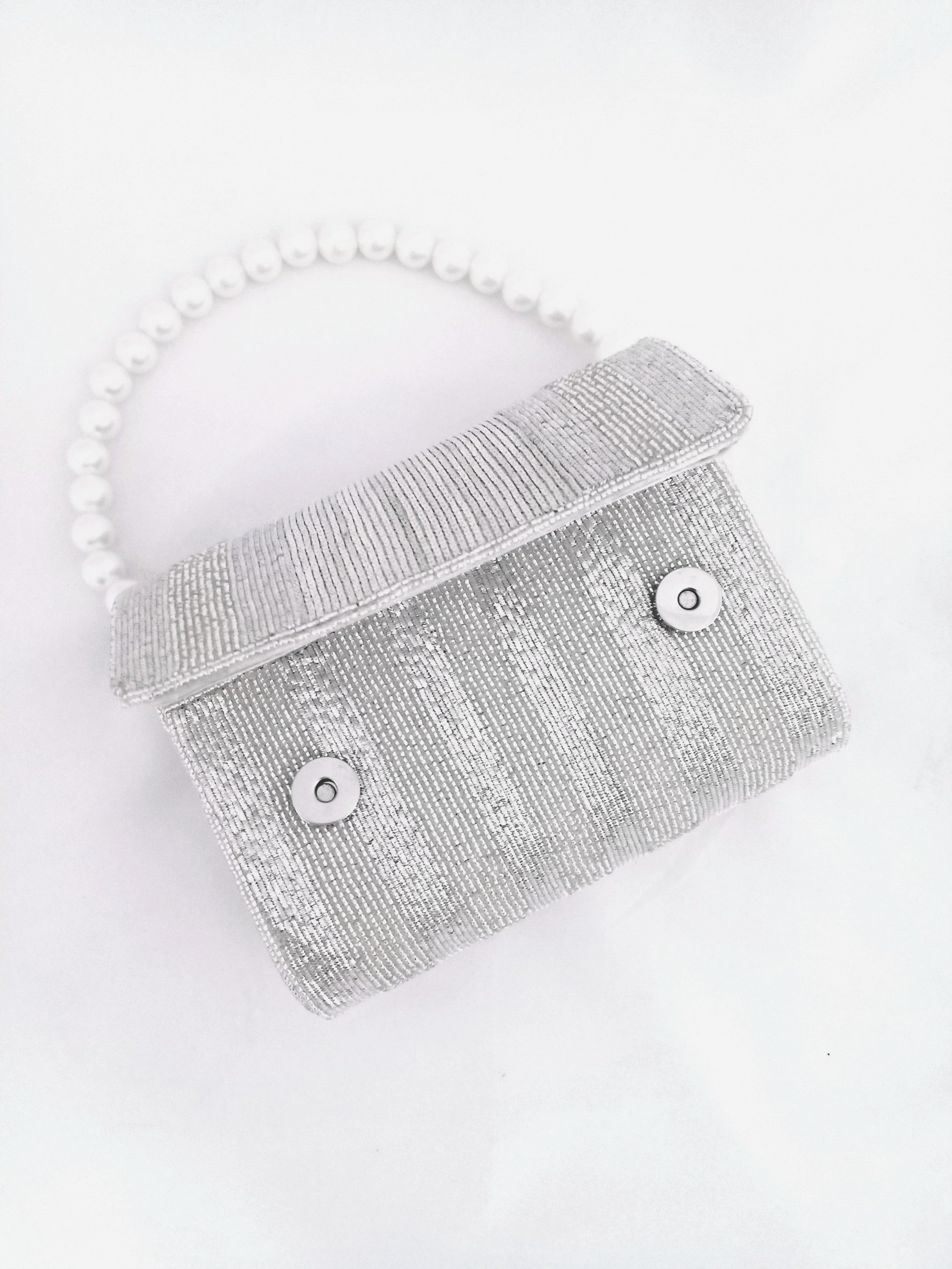 Hand embroidered Silk Lining with Bugle beads work on both sides. Comes with a White Pearl Handle