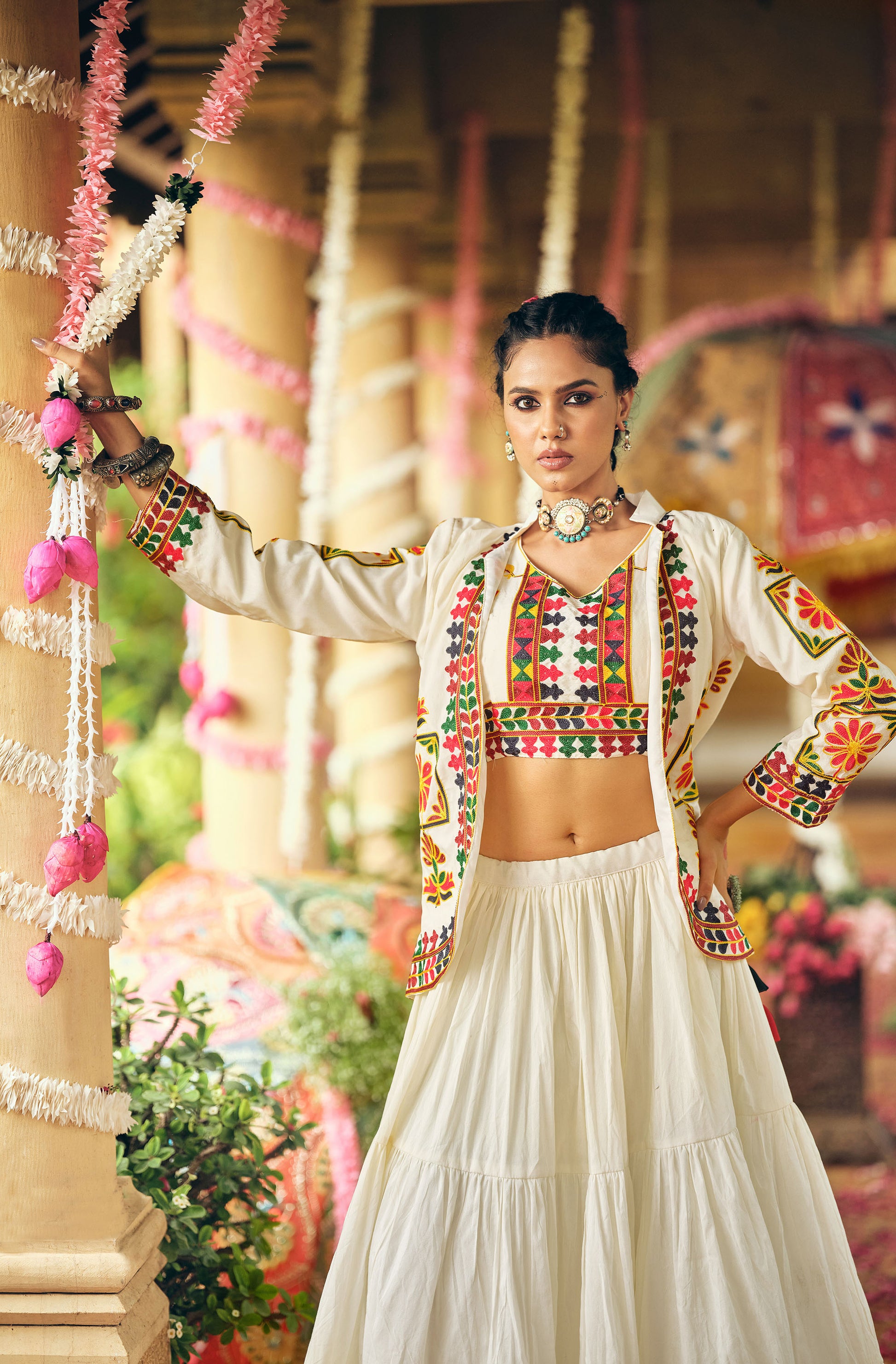 White Cotton Thread Embroidered Navratri Chaniya Choli