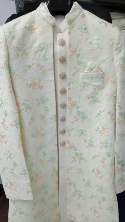 White Open Long Indo Western Set in Multi Tread work with Imported Japanese Fabric, paired with Long Sleeveless Jacket featuring Hand and Resham work Buttons and Matching Pant.