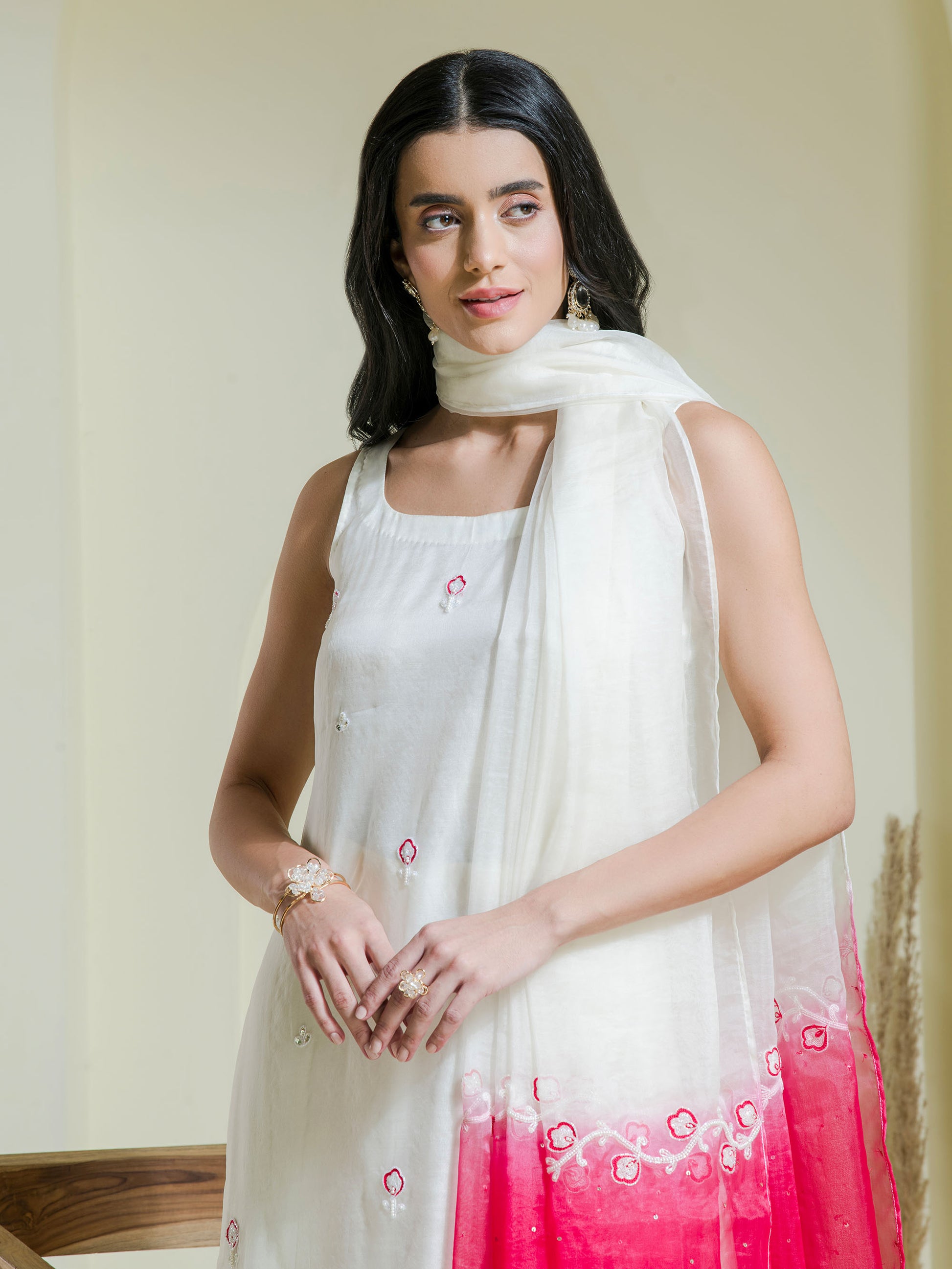 Step into elegance with our super white organza three piece kurta set.It showcases intricate resham work detailing in contrast pink colour mixed with pearls and glass beads.Paired with white and pink shaded dupatta