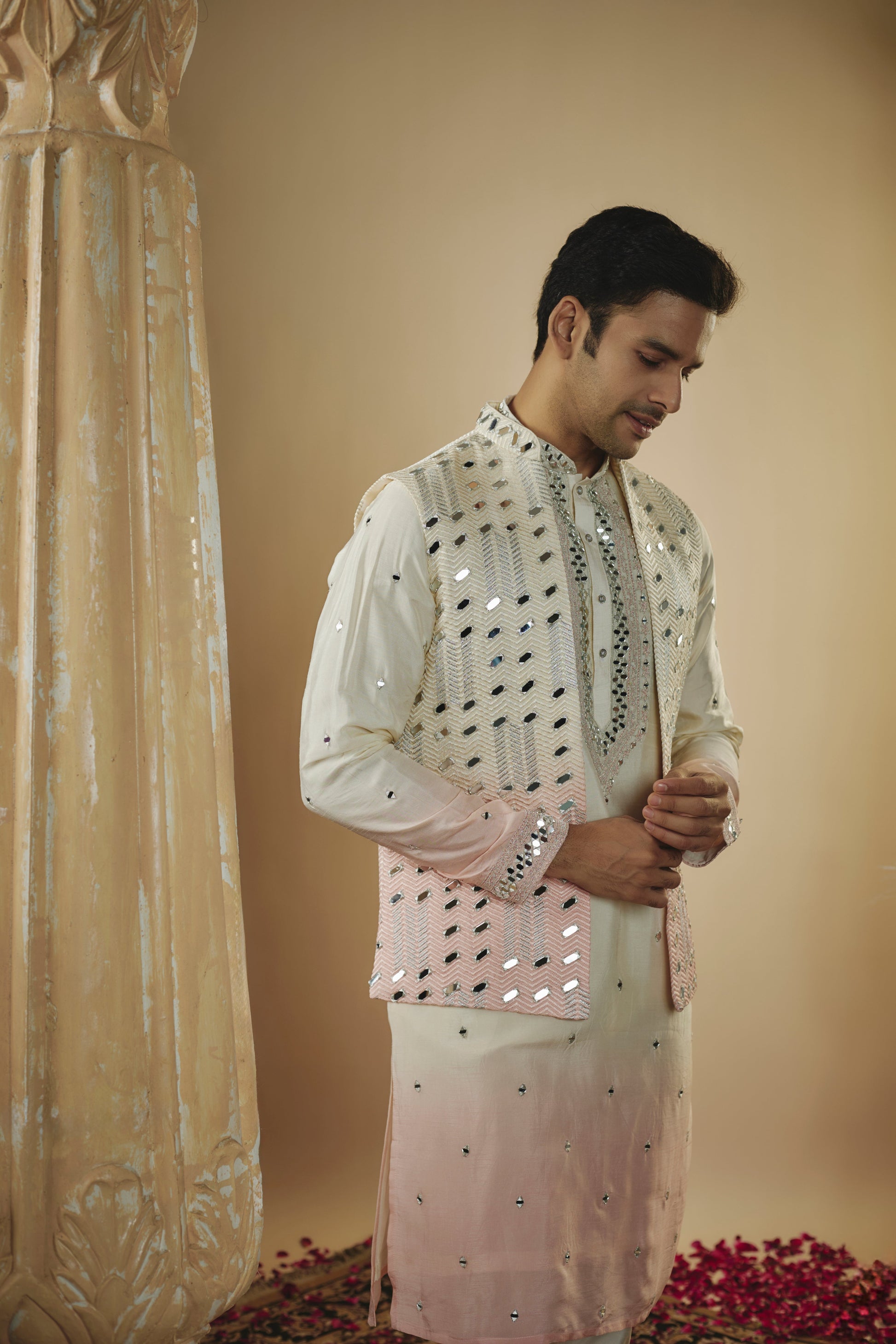 White pink ombre lucknowi art silk mirror embellished kurta jacket set