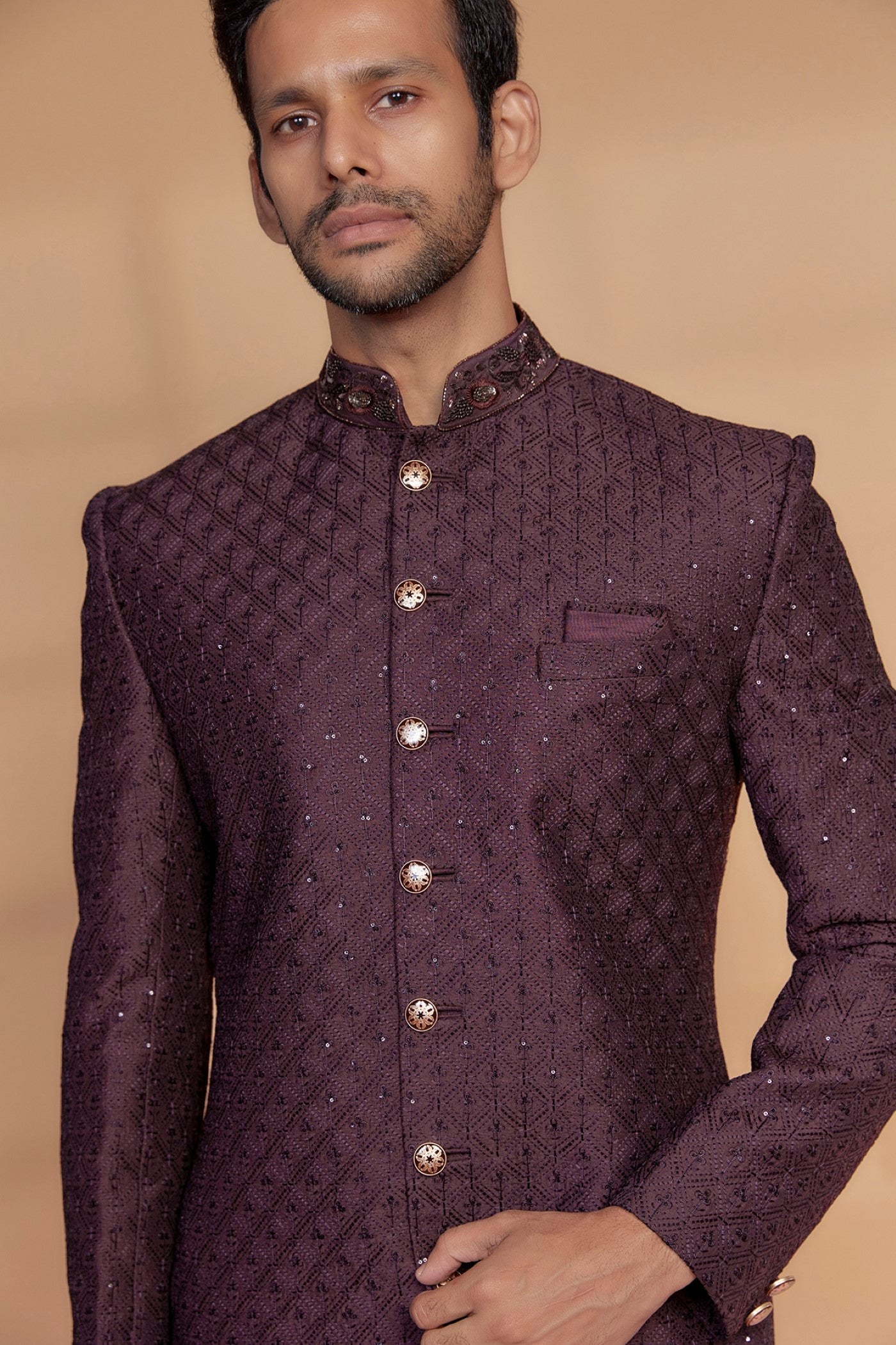 Featuring a wine sherwani in raw silk base with handwork. It is paired with black pants. Perfect wear for a sangeet or reception ceremony.