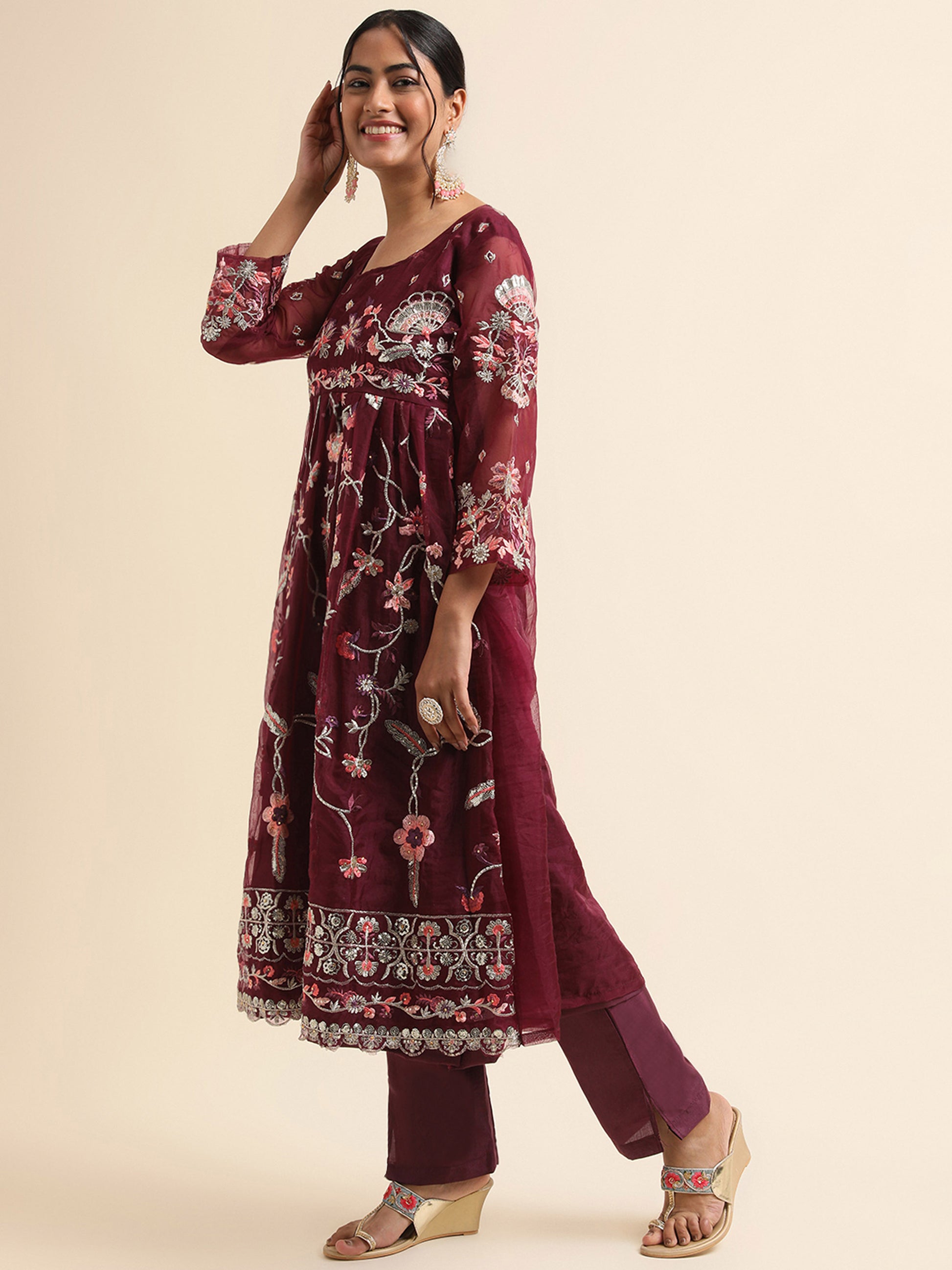Wine sequins embroidered Faux organza Surya pakistani suit