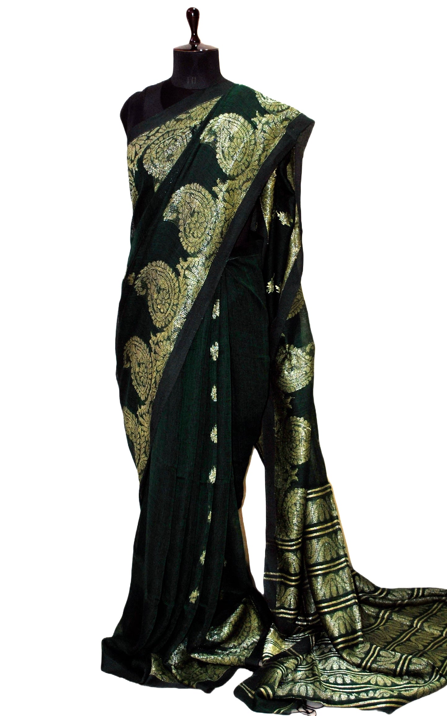 Woven Paisley Motif Work Border Linen Jamdani Saree in Black and Antique Silver