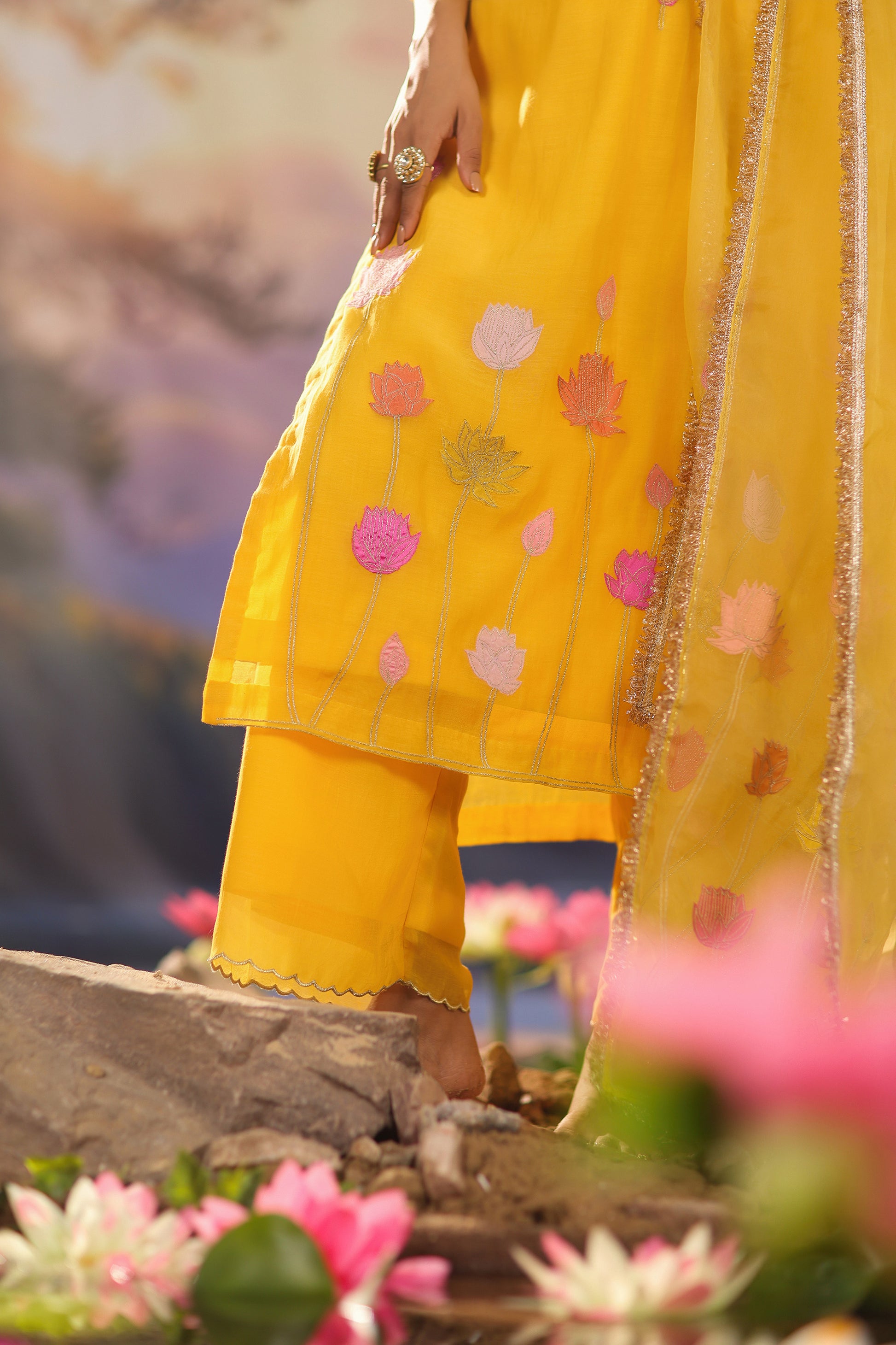 A sunshine-hued mul Chanderi straight suit set, delicately adorned with lotus appliqué on the kurta. Paired with scalloped palazzos and a pure organza dupatta blooming with matching lotus motifs — a radiant blend of softness, grace, and timeless artistry.