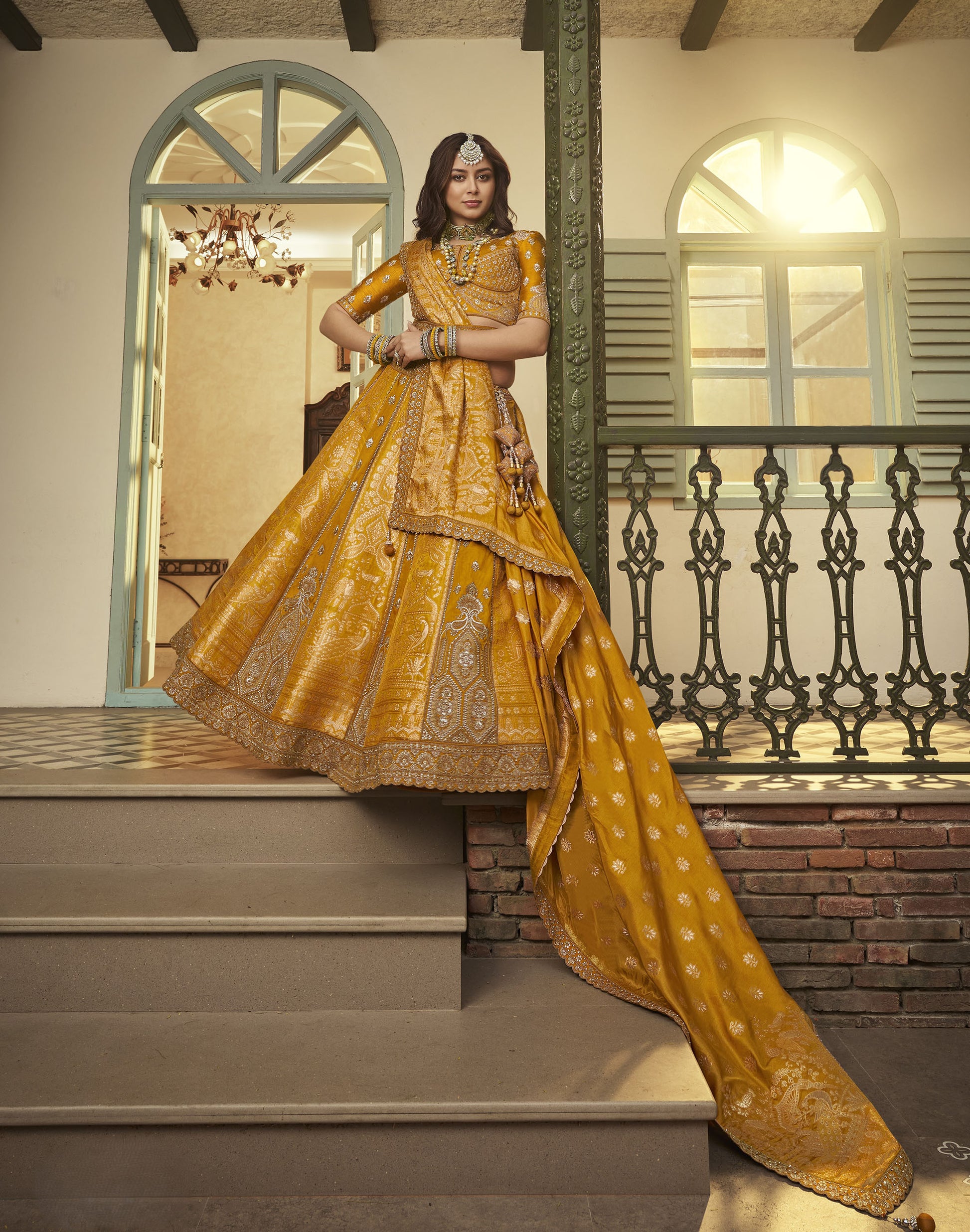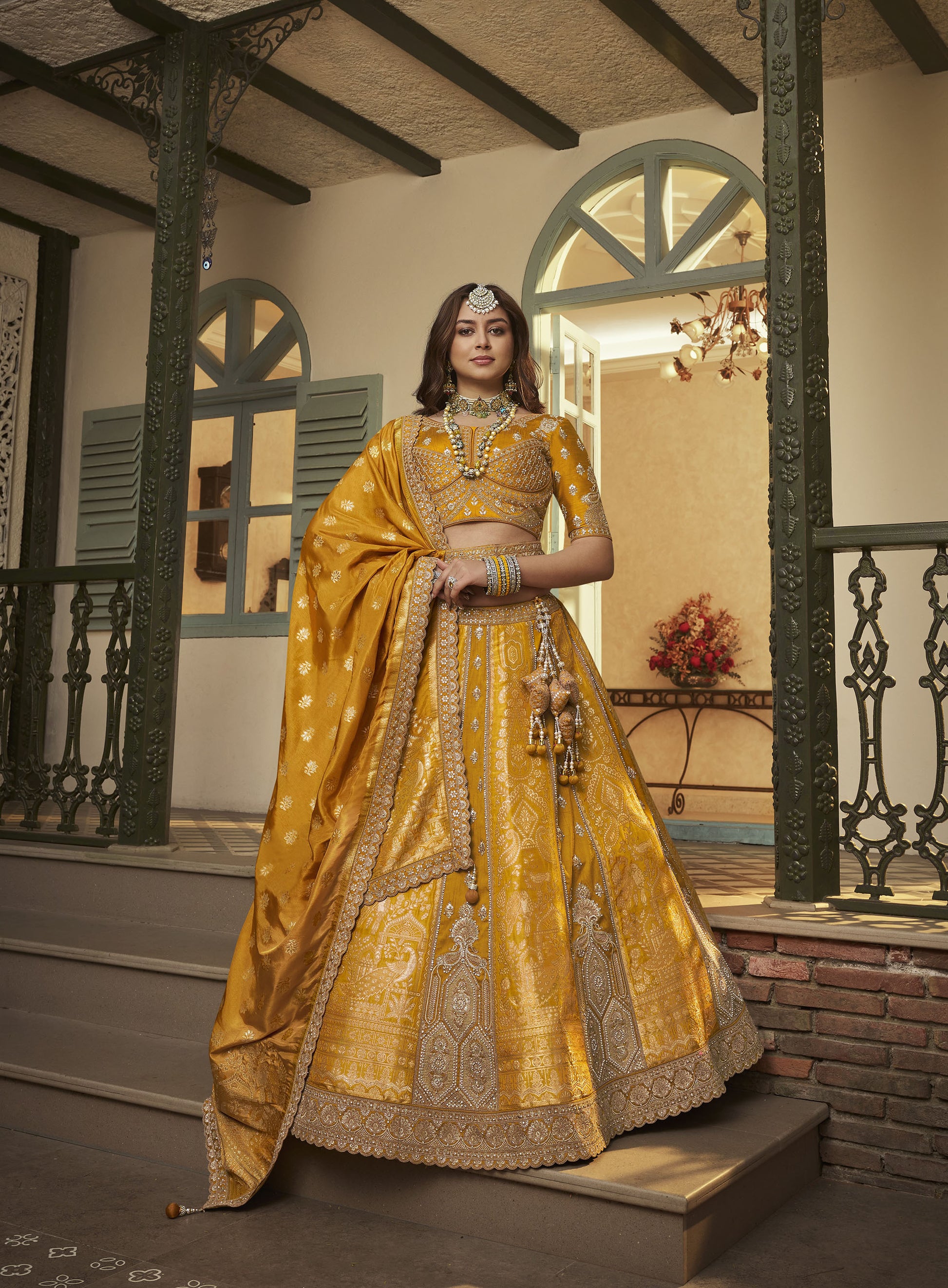 Yellow Banarasi Silk Sequins & Swarovski Work Bridal Lehenga for Haldi