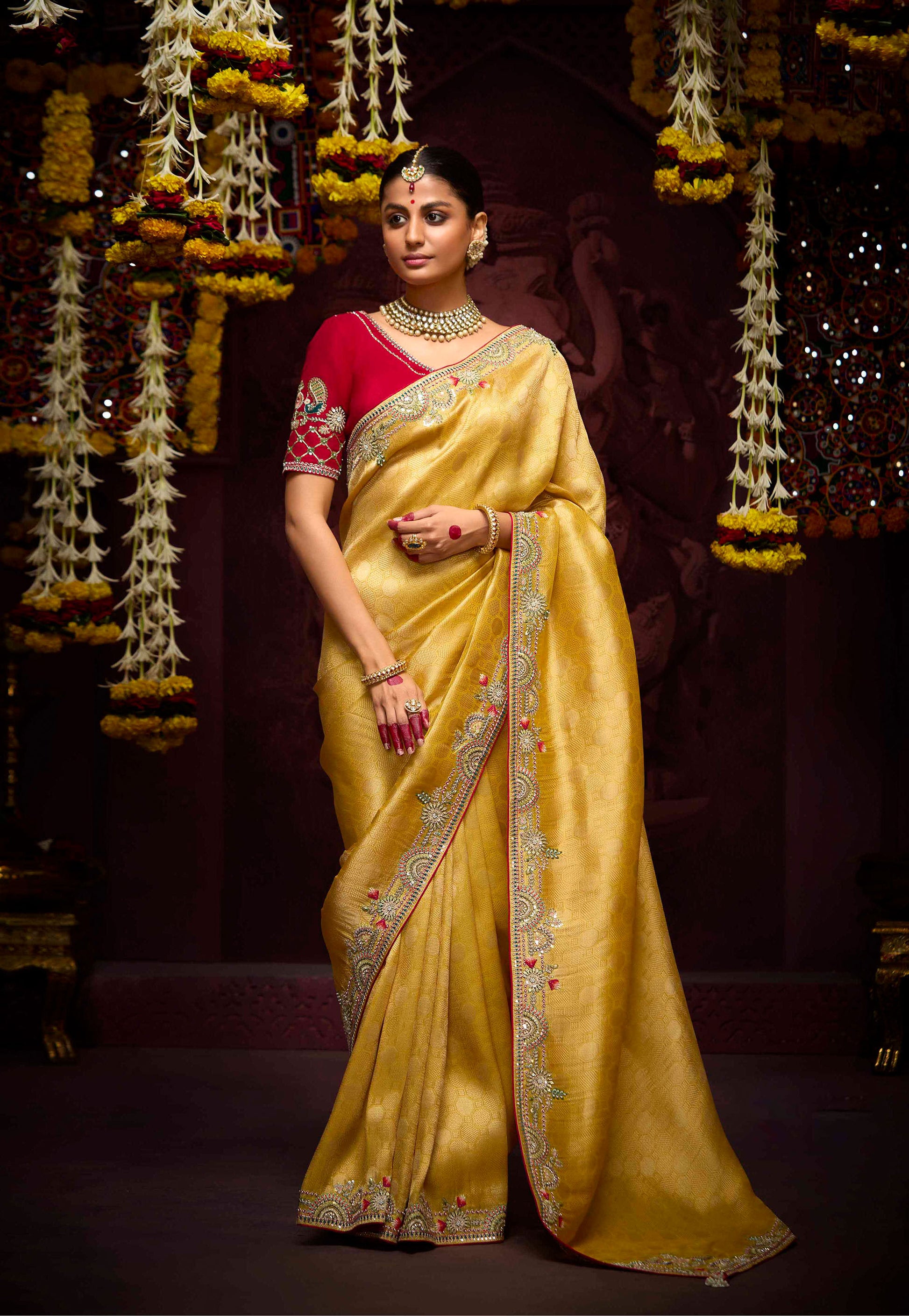 Yellow Banarasi Zari Woven Prasang Wedding Saree