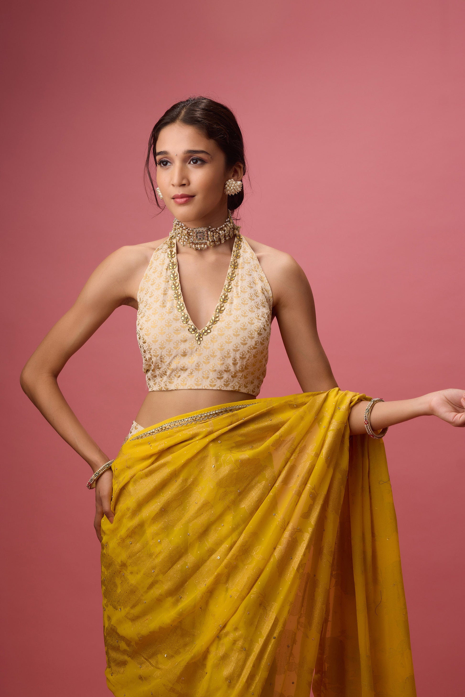 Ghee colour crepe foil printed dhoti with halter neck embroidered blouse with yellow Badal Sitara foil printed drape saree and handmade latkans.