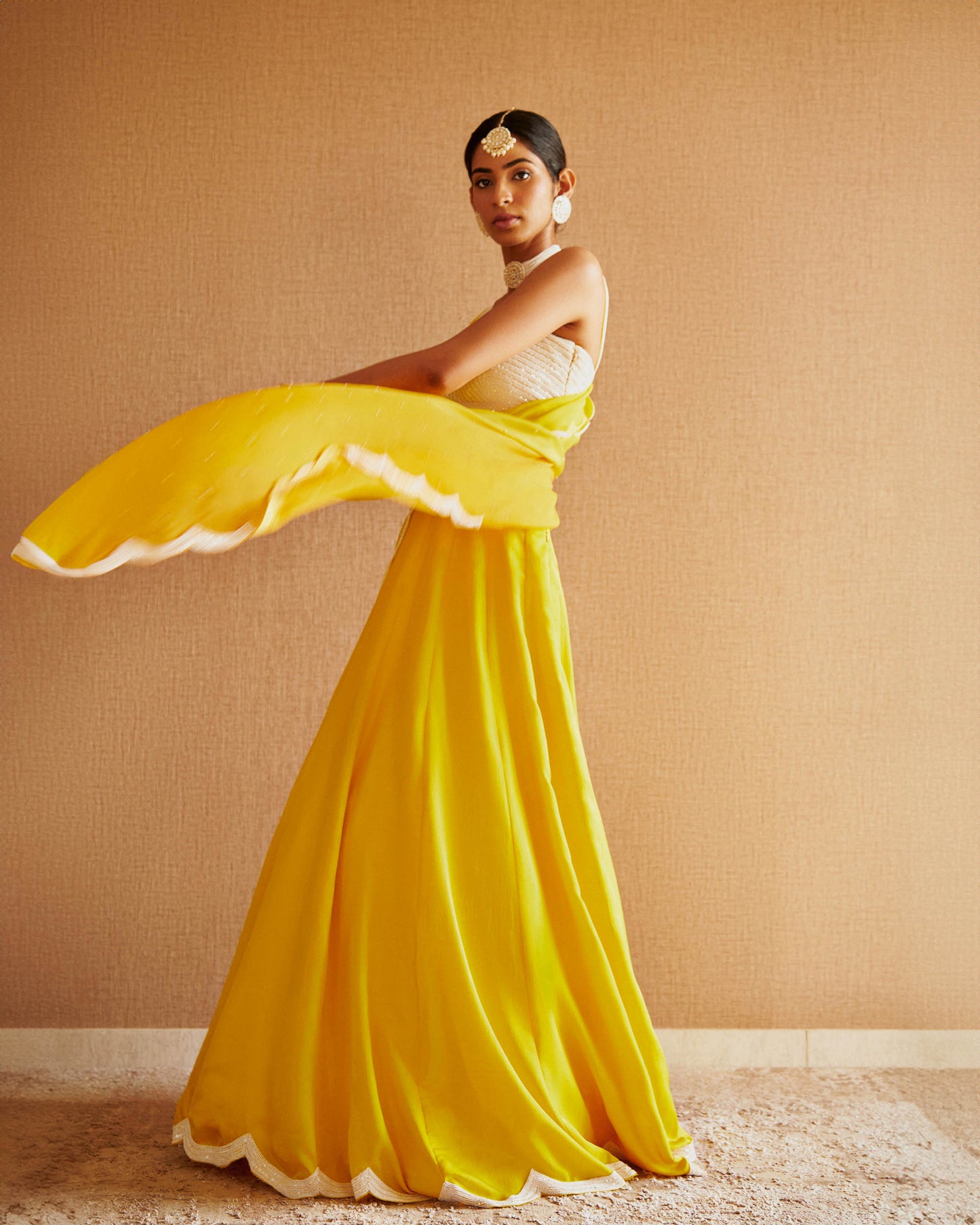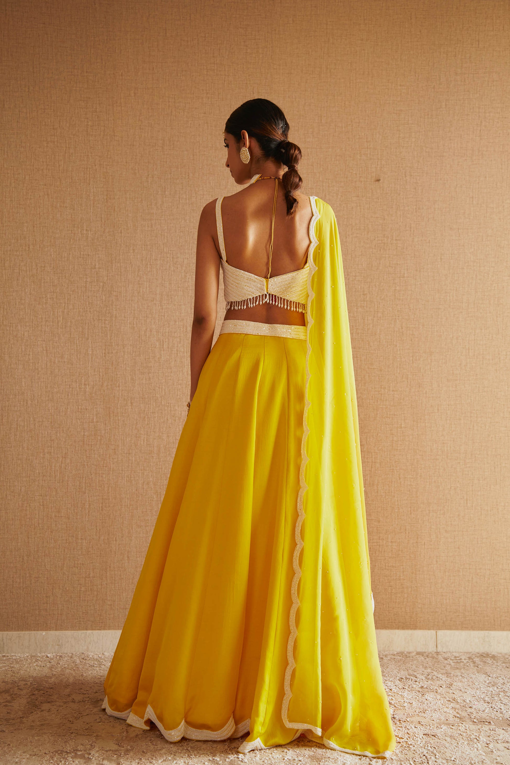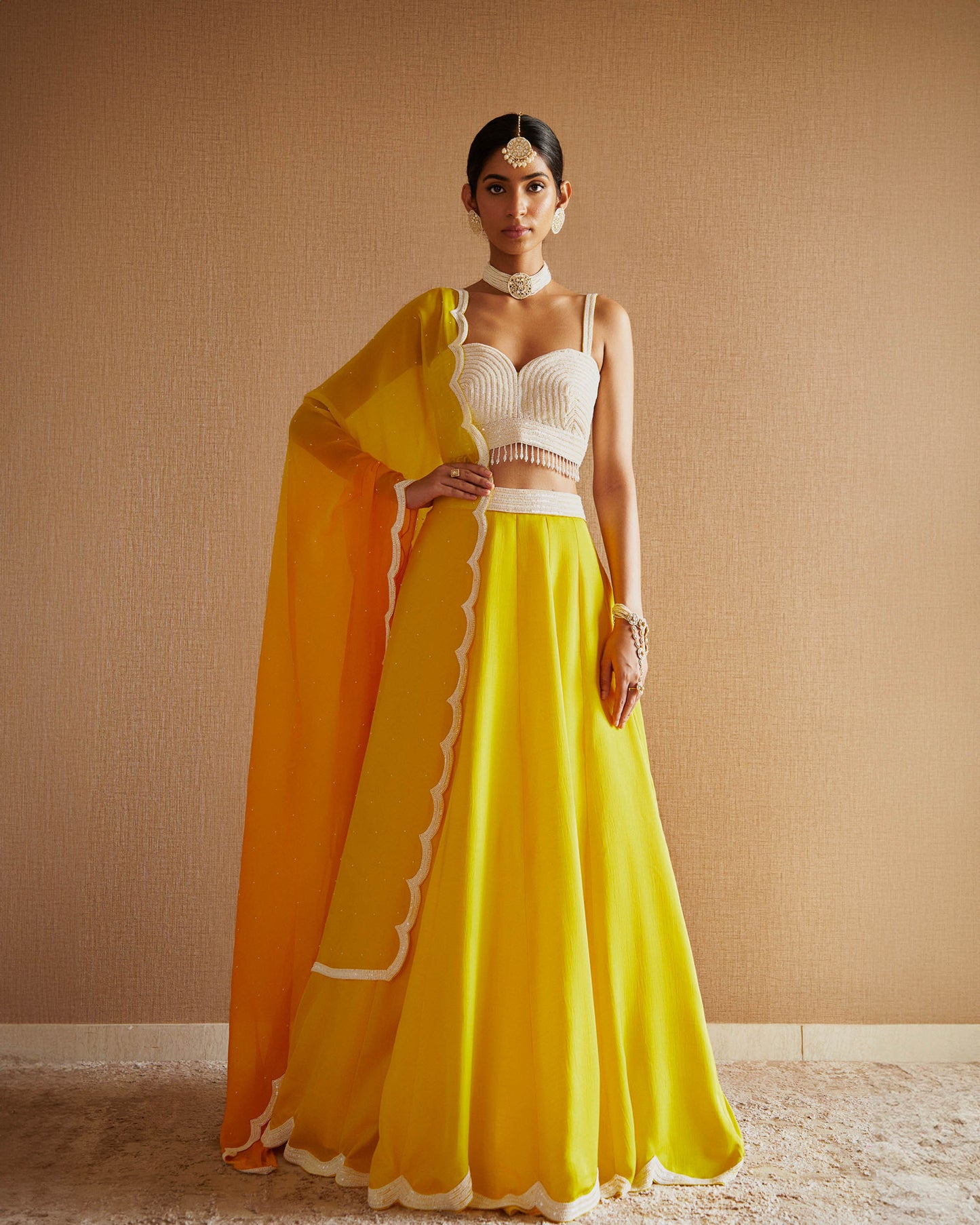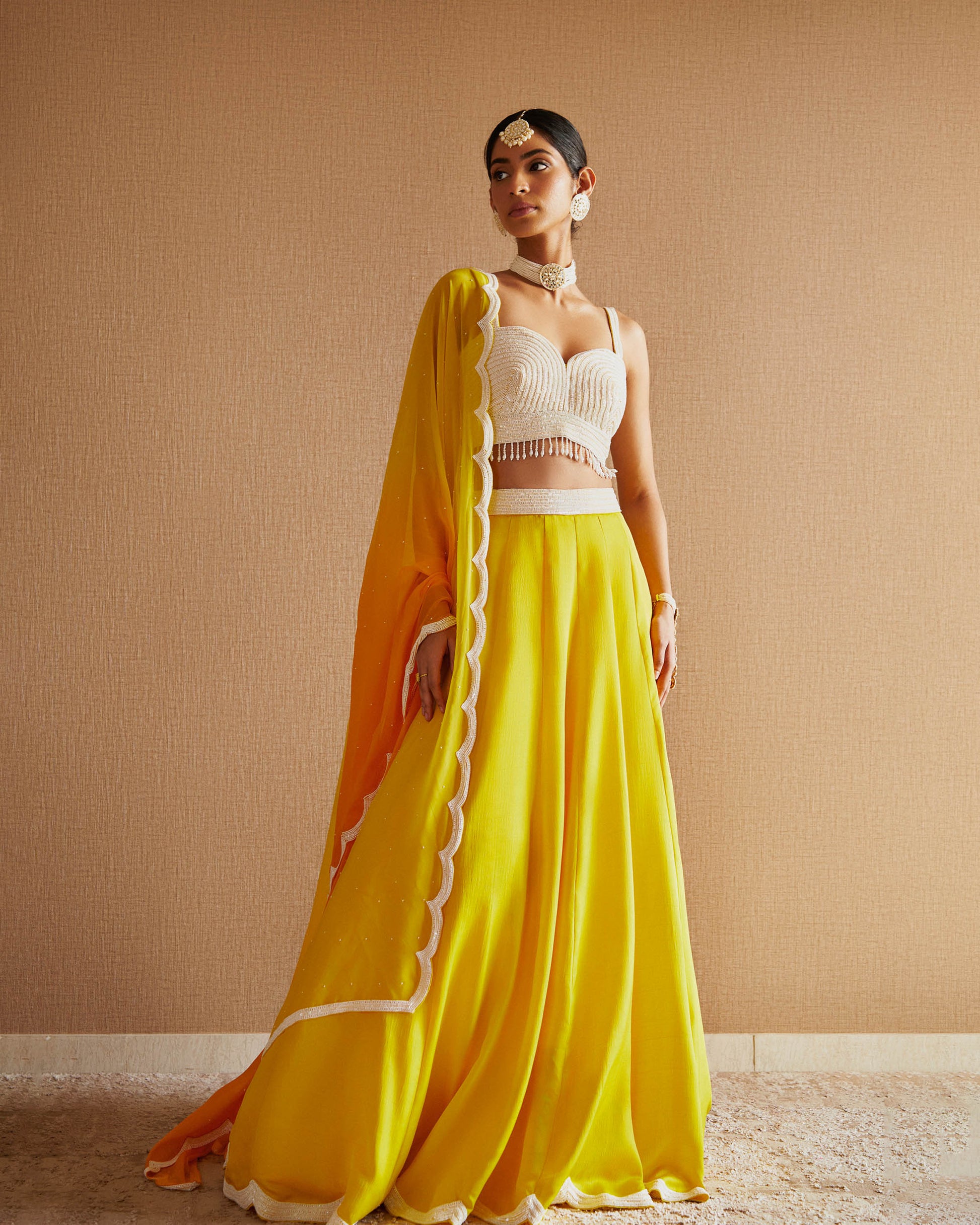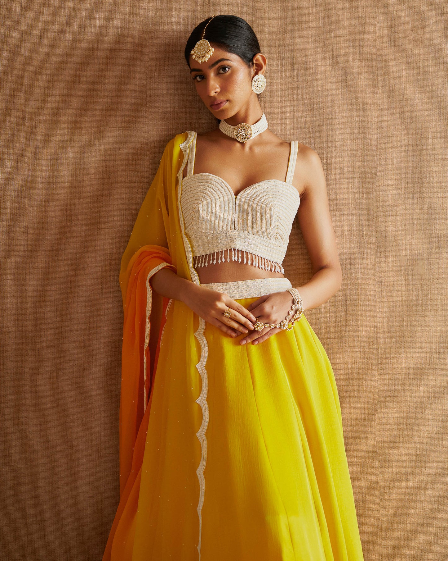 Yellow heavy cutdana, sequin and pearl embroidered blouse with embellished matching lehenga and embellished shaded organza dupatta.