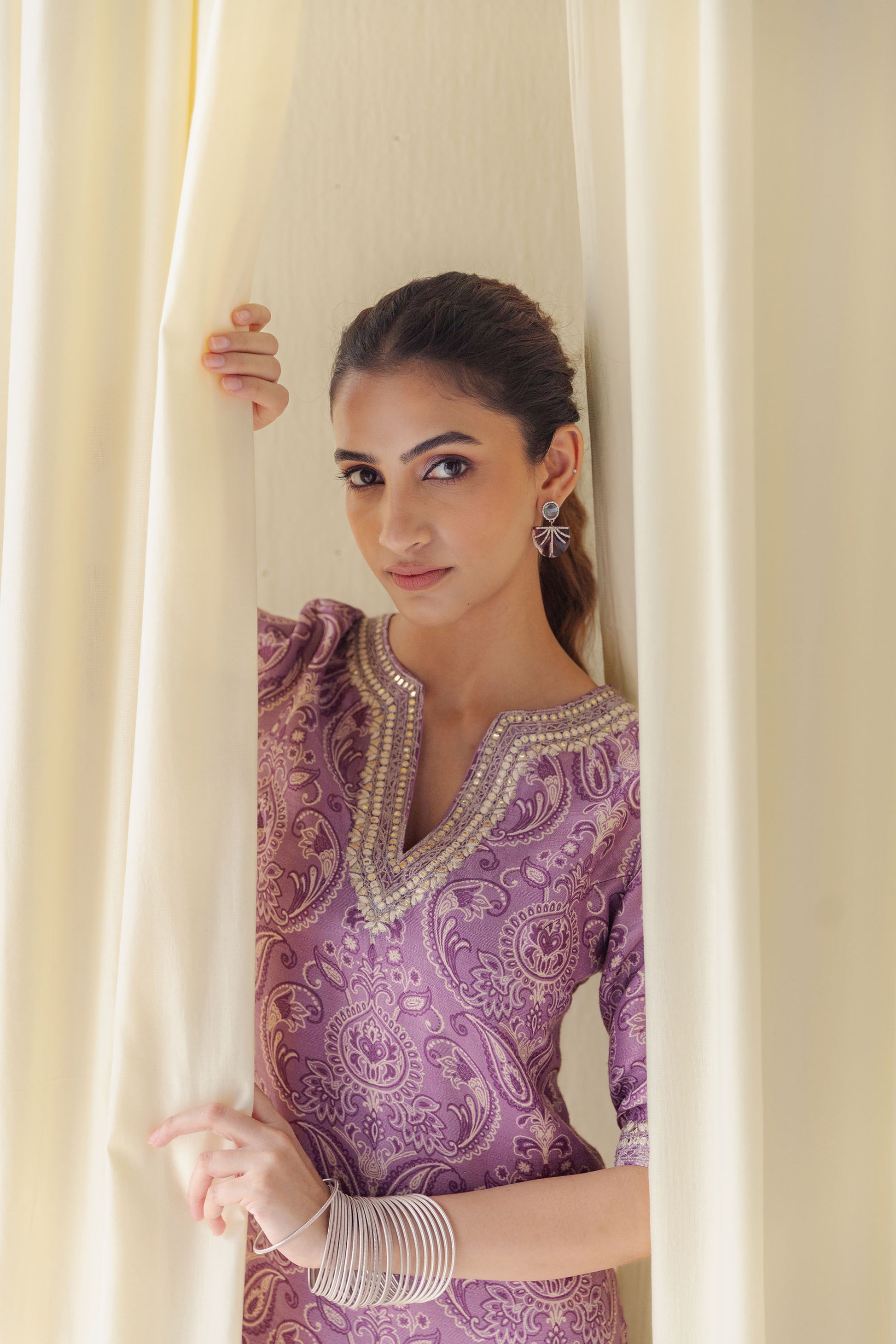 The Zaina Set features a dusty purple raw silk kurta with paisley print and silver gota embroidery on the neckline, hem, and sleeves. Paired with flared palazzos and a contrasting gold line jacquard dupatta.Product Type: Three-Piece SetPattern: Paisley Print with Gota EmbroideryLength: Kurta – Knee-Length | Pants – Full-LengthClosure: Slip-OnLining: Fully Lined