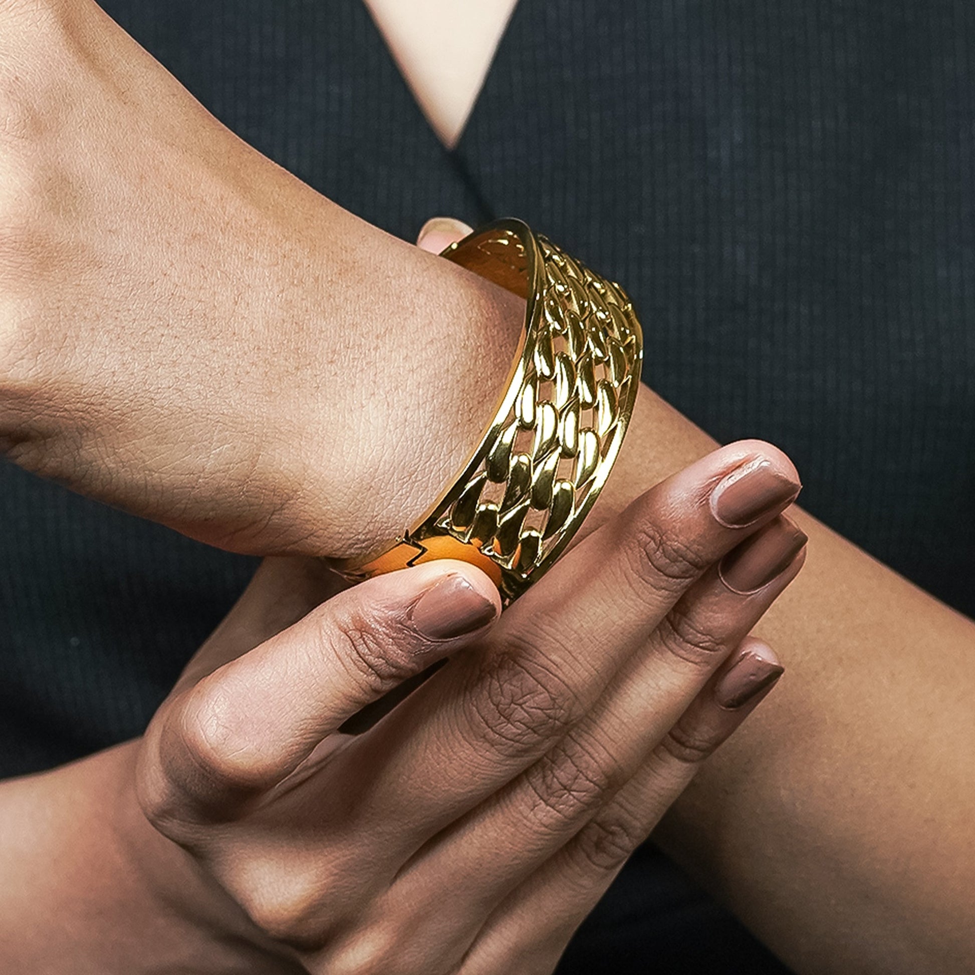 This gold tone stainless steel bracelet showcases a bold link design with a waterproof tarnish-free finish. A trendy, premium and stylish accessory for women & girls to elevate party and special occasion looks.