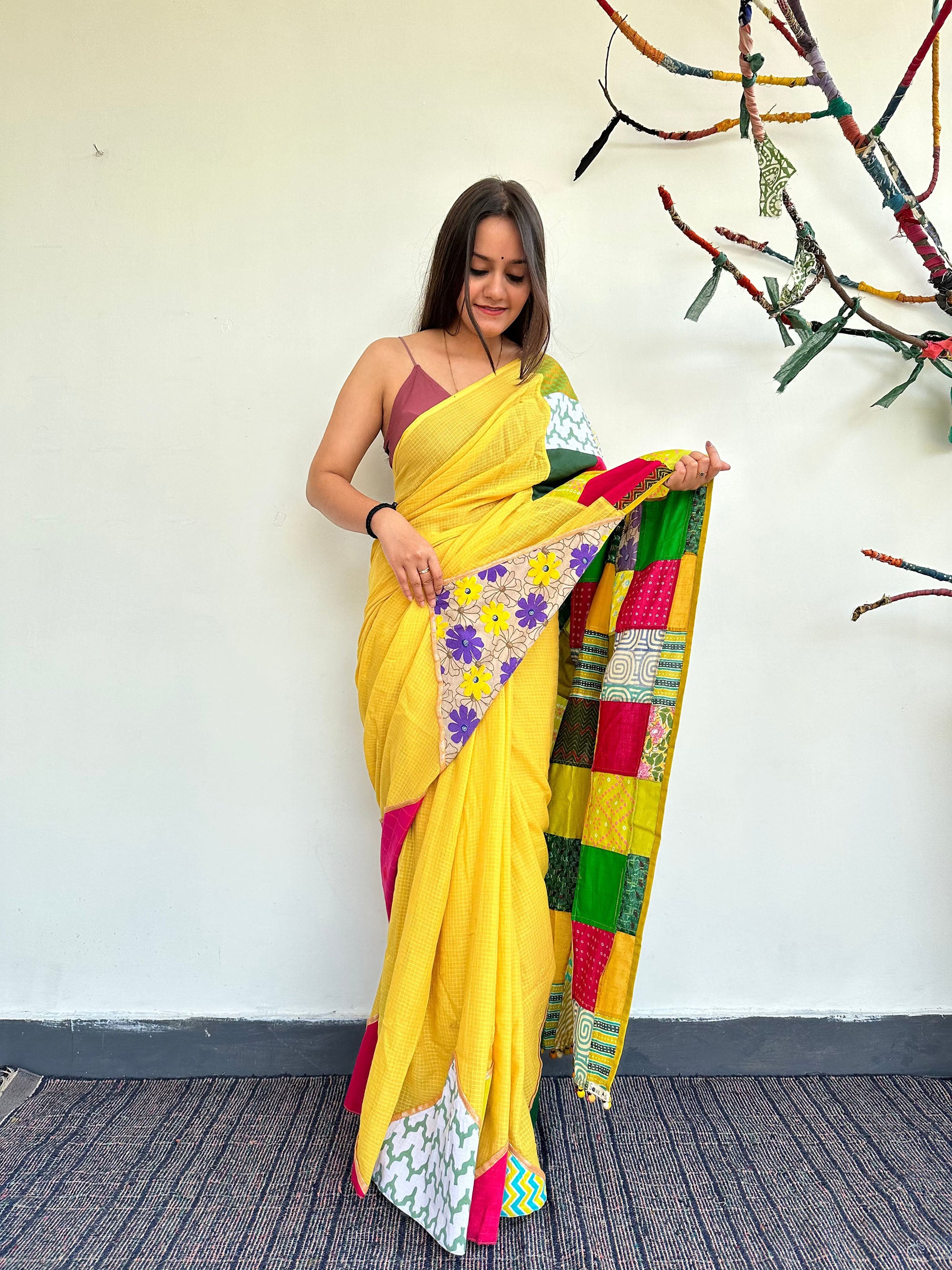 Introducing the अतरंगी Saree 🌈, a vibrant and sustainable piece of clothing that is custom-made for each order, ensuring that every saree is unique. Made from a patchwork of colorful fabric scraps, this saree is a perfect example of zero-waste design. Crafted from 100% cotton, it's comfortable to wear and eco-friendly 🌿.