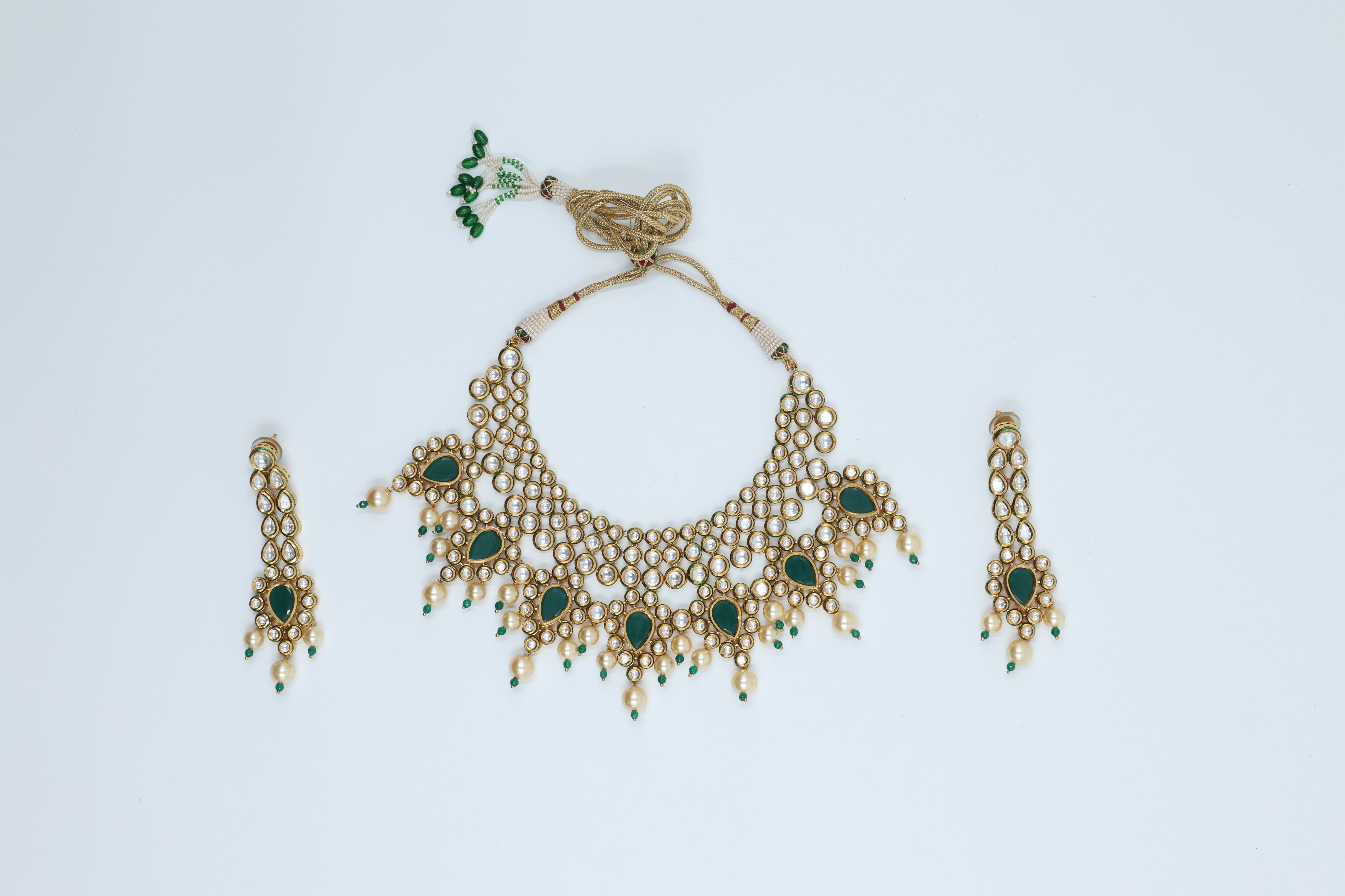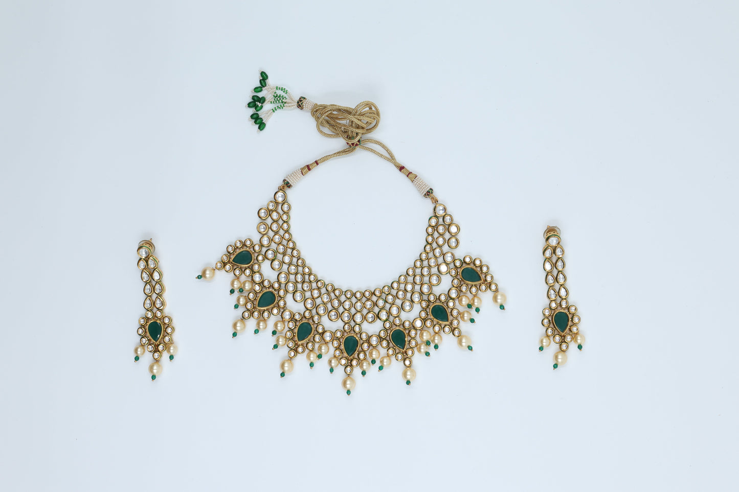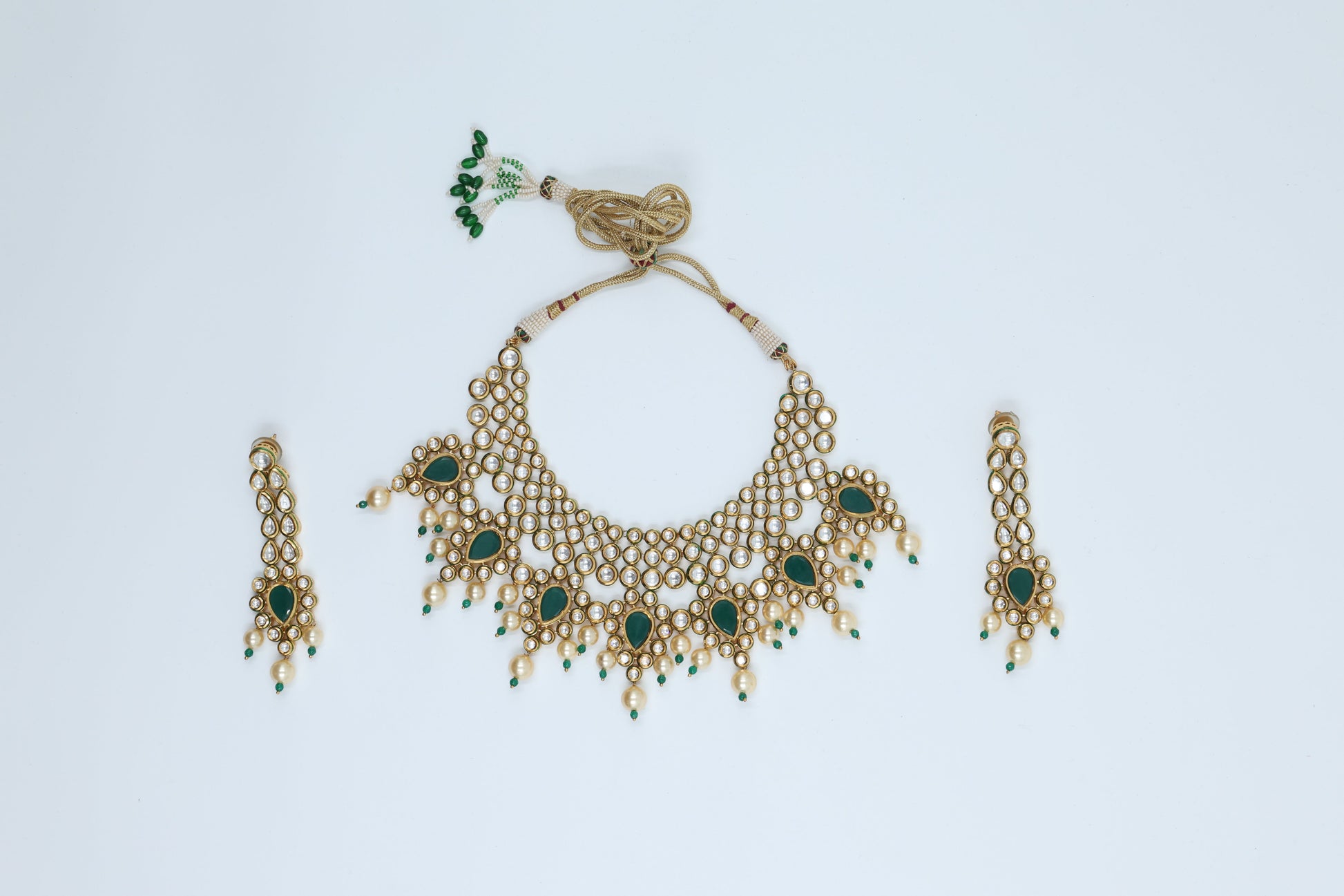 Transform into a radiant bride with our 22K Gold Plated Bridal Green Kundan Set. The intricate design and vibrant green Kundan stones will add a touch of elegance and luxury to your special day. Feel confident and beautiful in this stunning jewelry set.