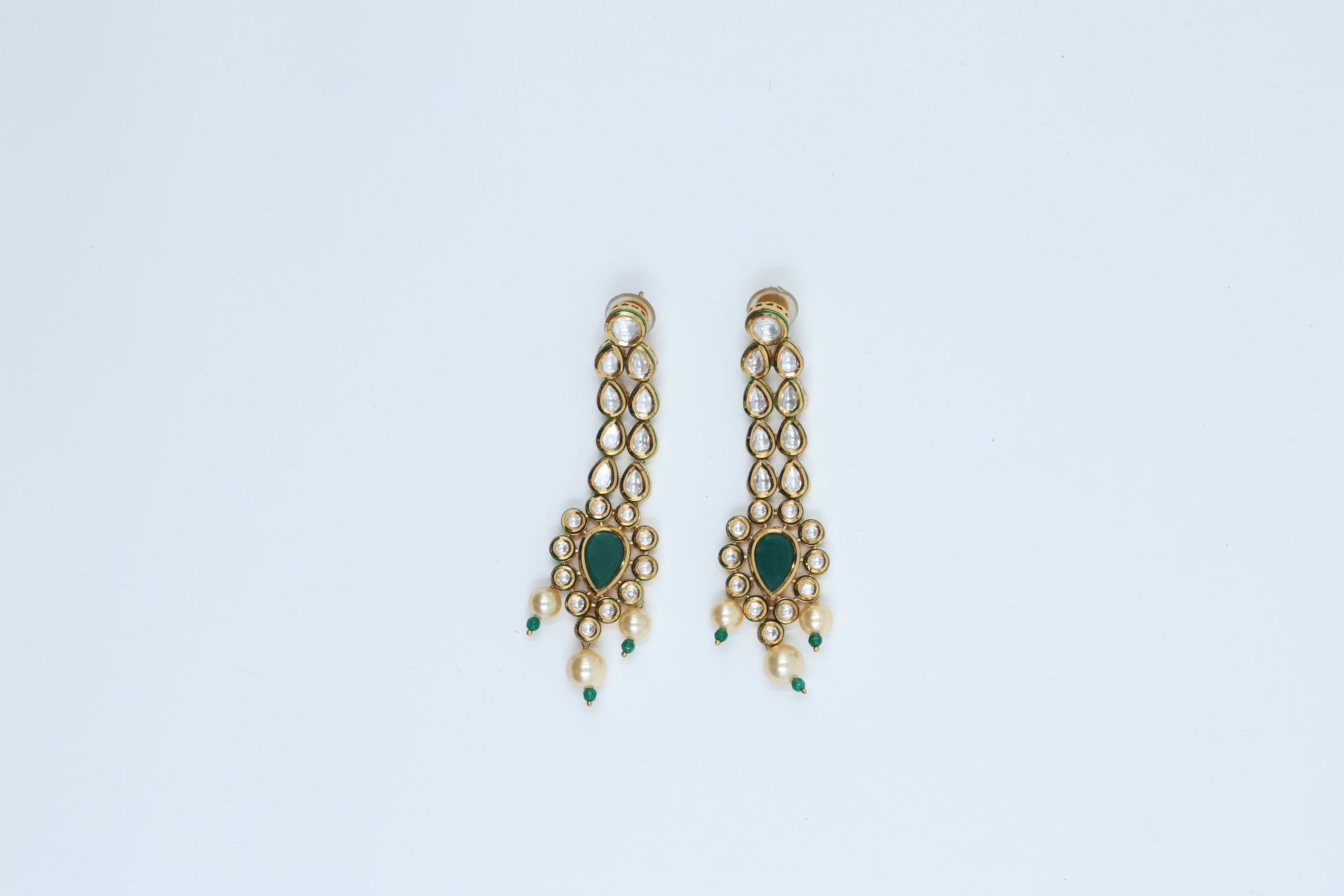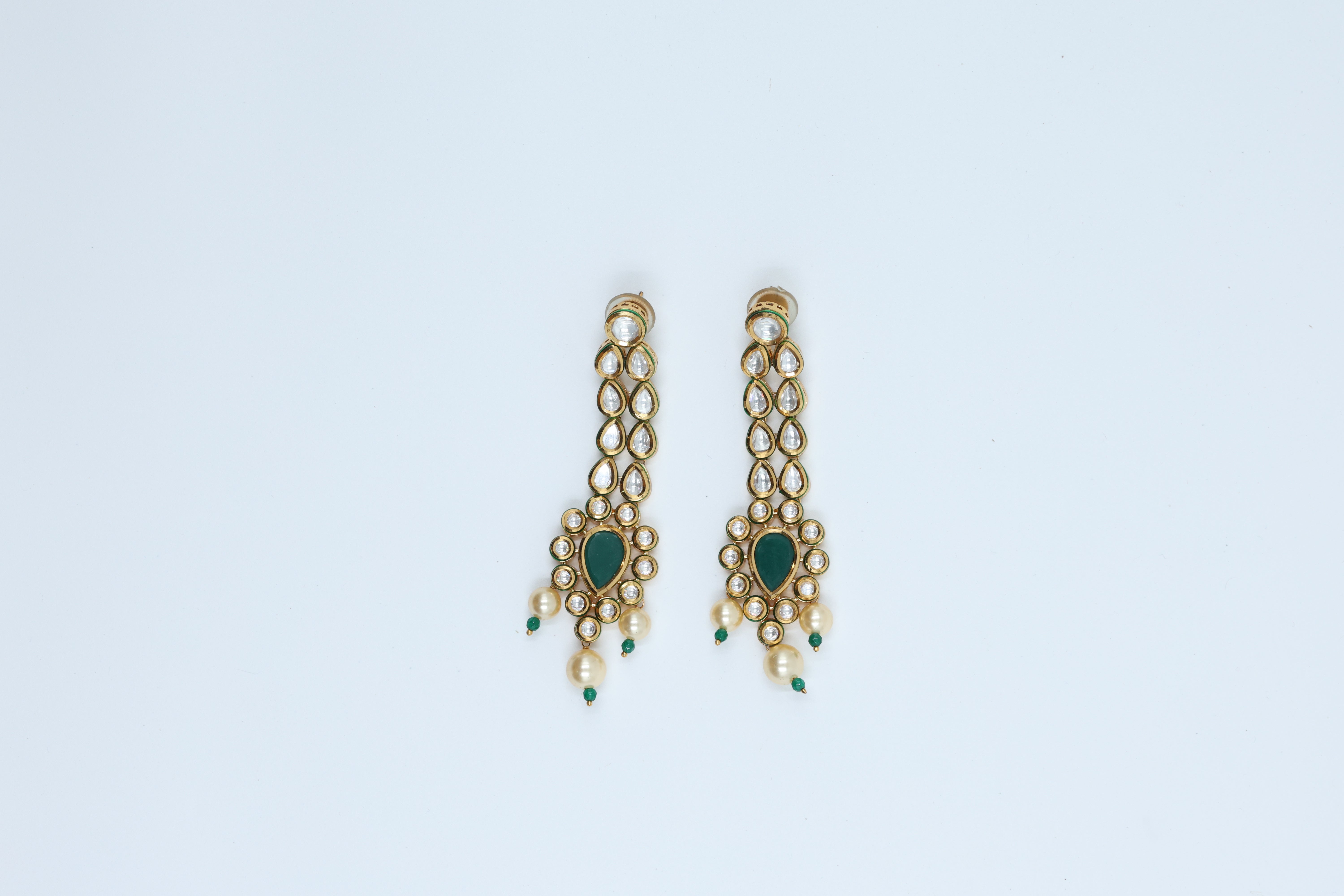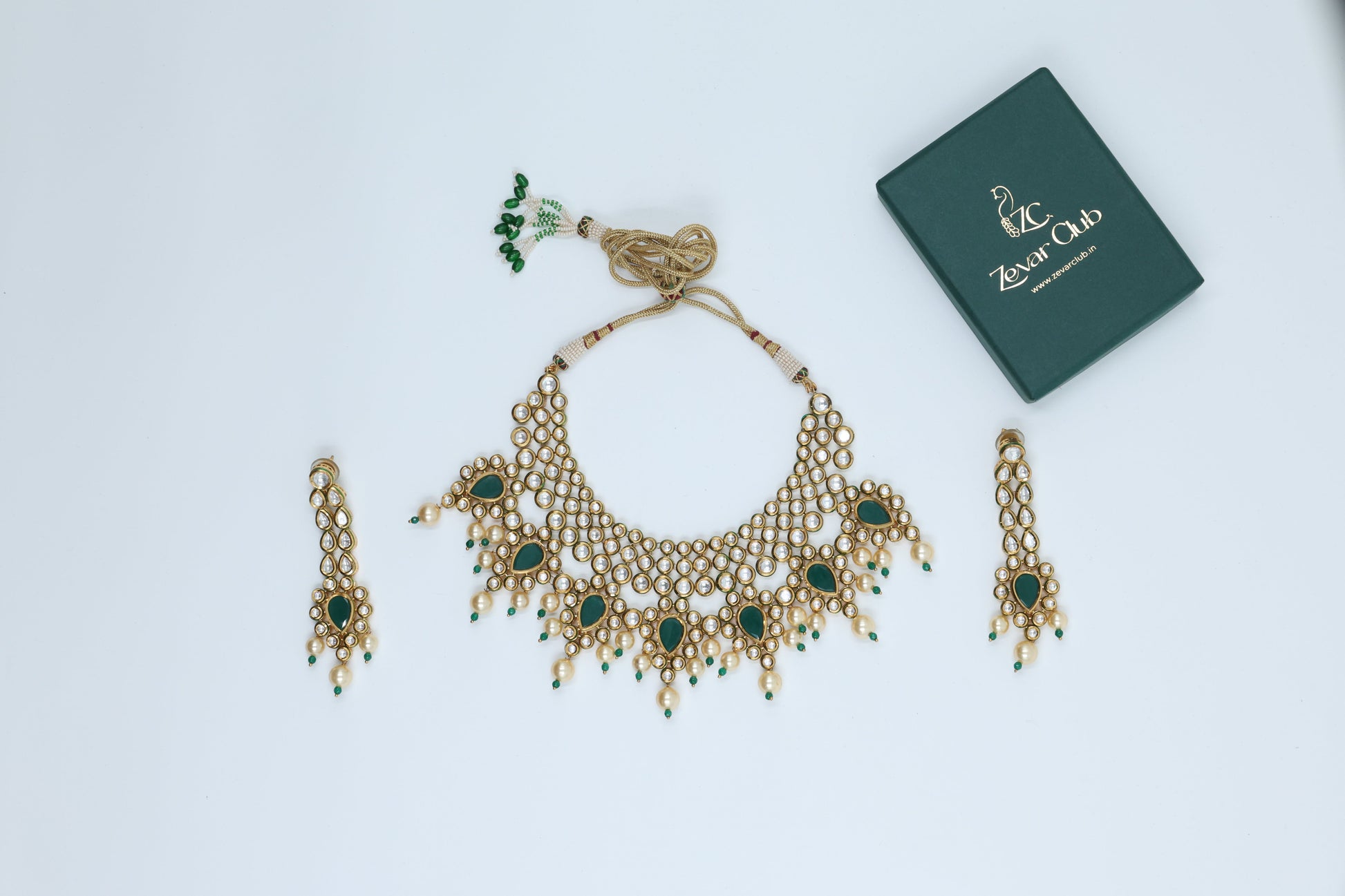 Transform into a radiant bride with our 22K Gold Plated Bridal Green Kundan Set. The intricate design and vibrant green Kundan stones will add a touch of elegance and luxury to your special day. Feel confident and beautiful in this stunning jewelry set.