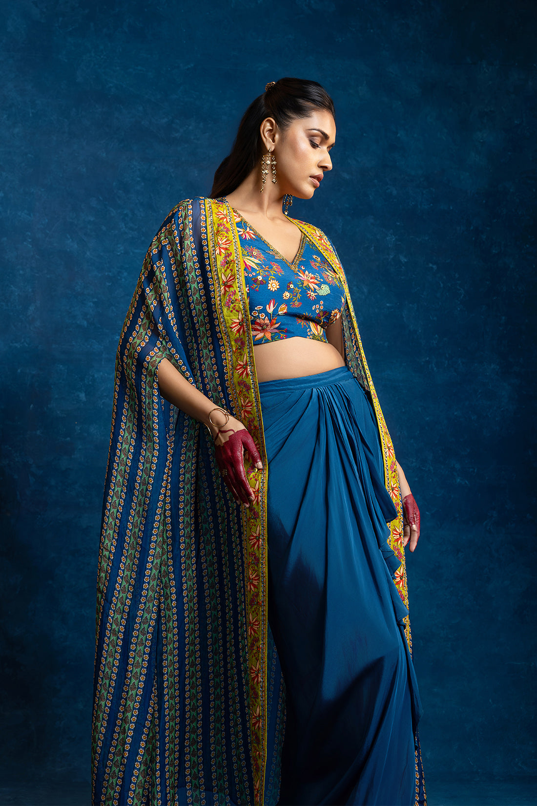 Blue Aarani embellished v-neck bustier and drape skirt in crepe, paired with long cape in organza.