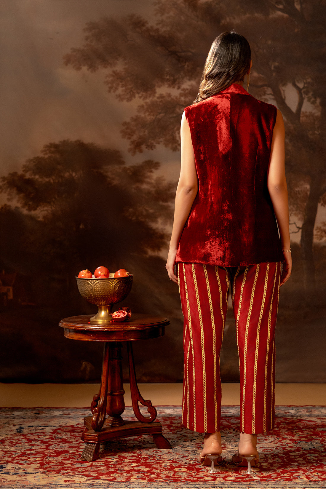 Red Aarani appliqué blazer in velvet, paired with embellished striped pants in Chanderi.