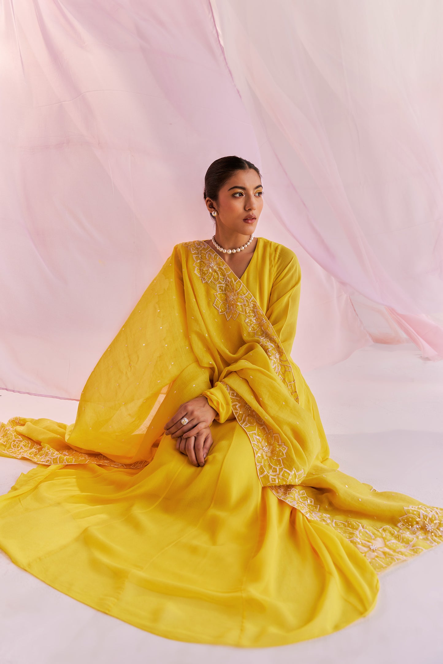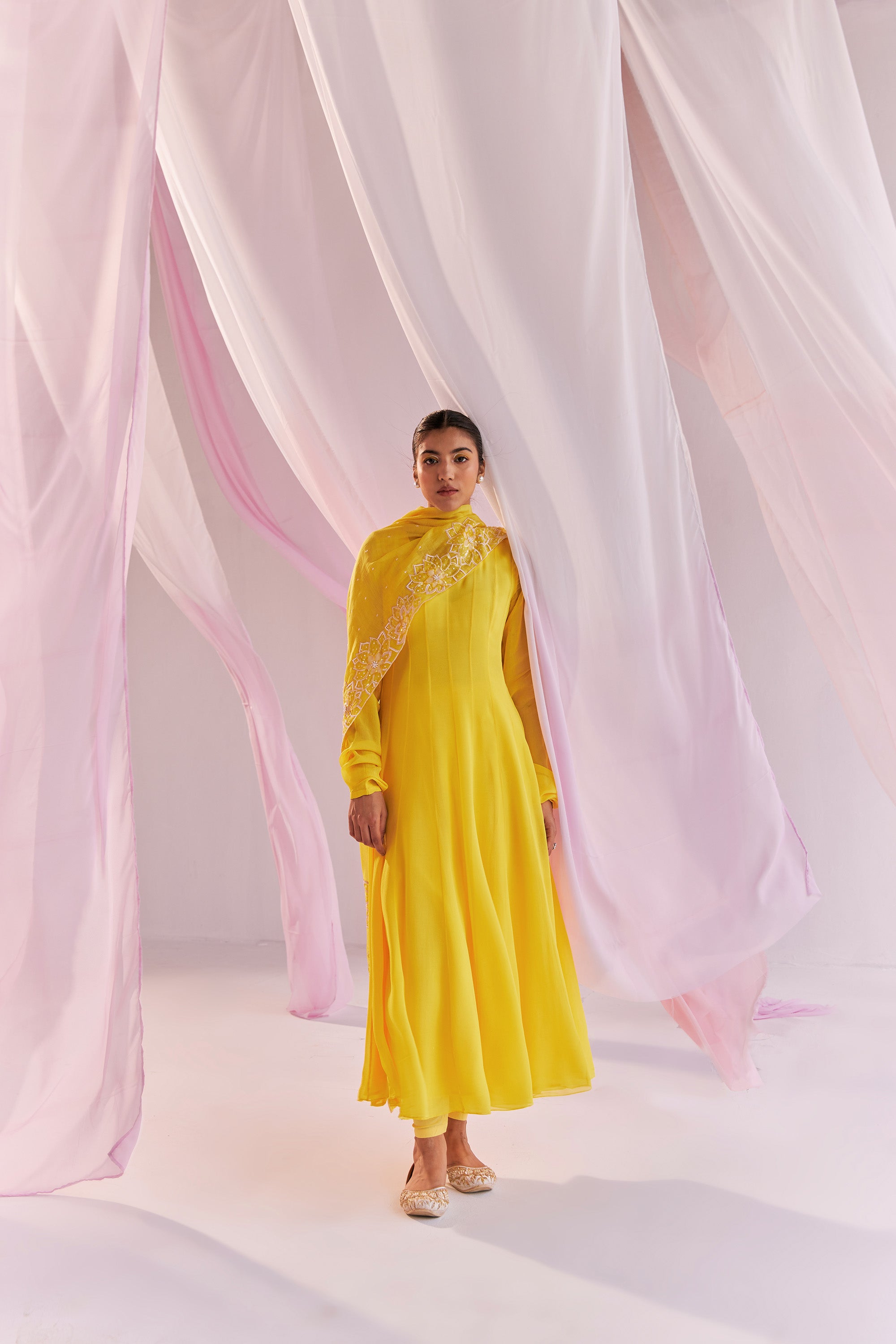 Alaia Georgette hand Embroidered Yellow Anarkali Set