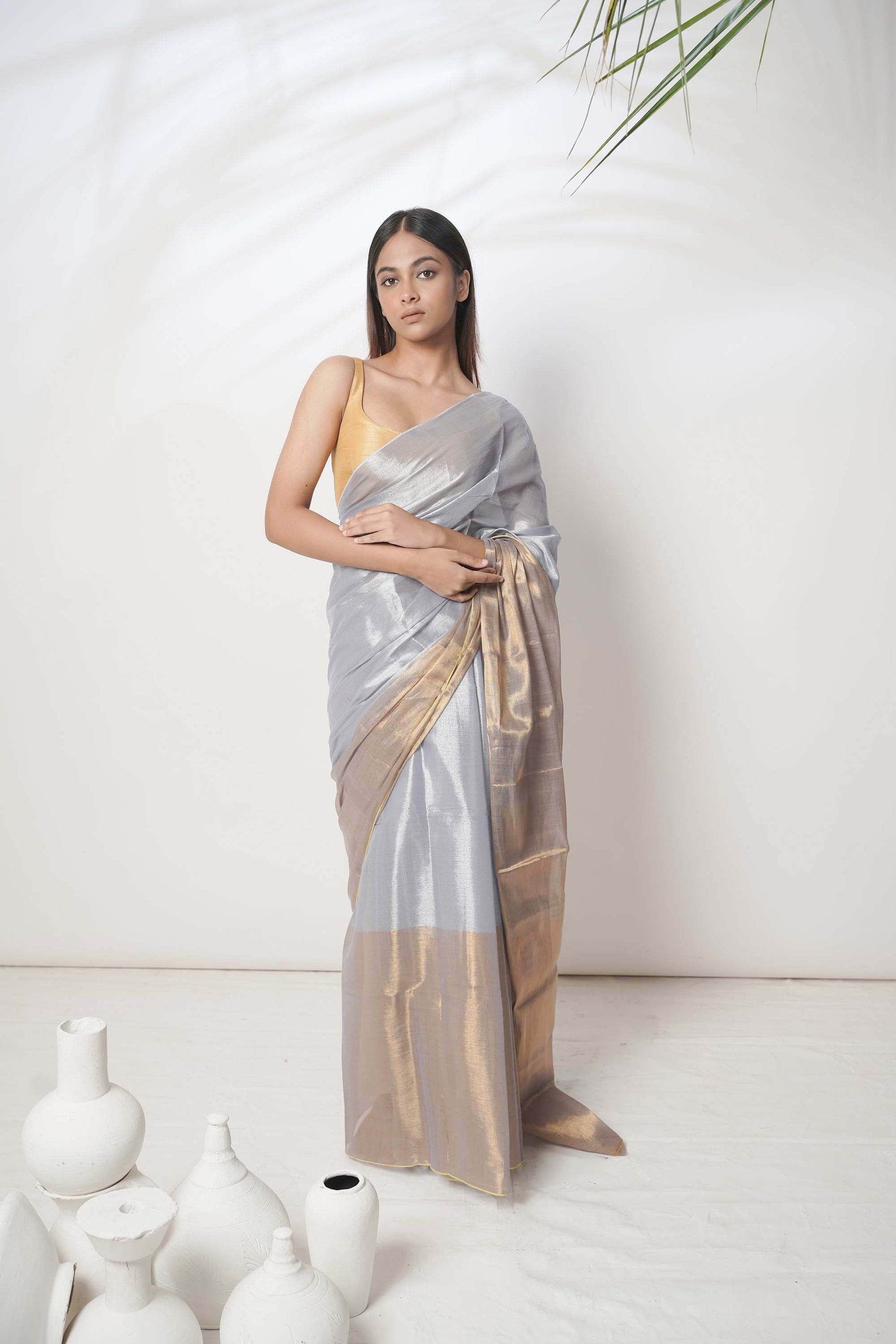 Alankrita | Slate Blue and Gold Handloom Tissue Saree